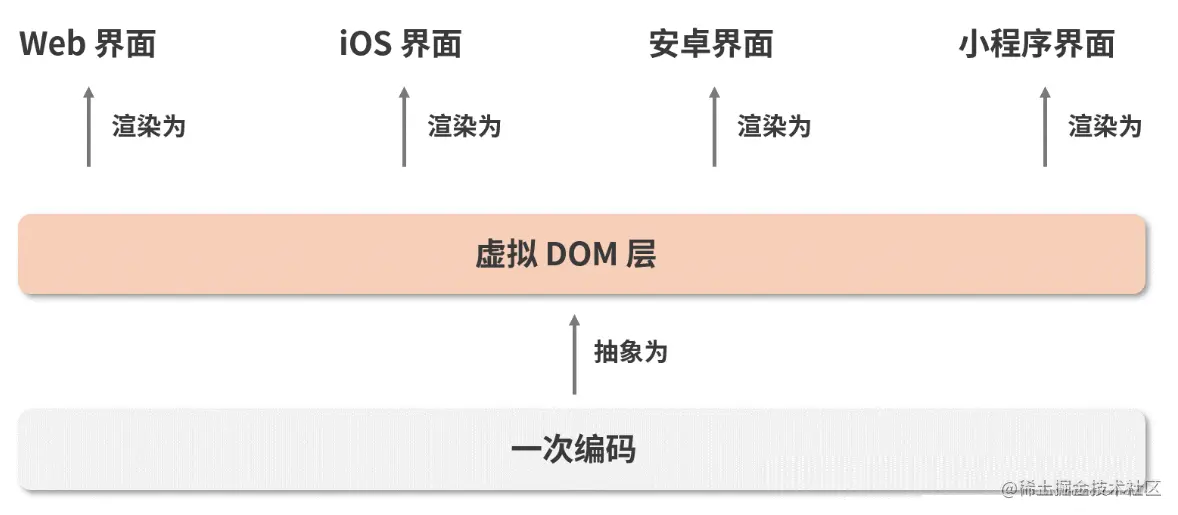 跨平台的问题:虚拟 DOM 是对真实渲染内容的一层抽象。若没有这一层抽象,那么视图层将和渲染平台紧密耦合在一起,为了描述同样的视图内容,你可能要分别在 Web 端和 Native 端写完全不同的两套甚至多套代码。但现在中间多了一层描述性的虚拟 DOM,它描述的东西可以是真实 DOM,也可以是iOS 界面、安卓界面、小程序......同一套虚拟 DOM,可以对接不同平台的渲染逻辑,从而实现“一次编码,多端运行”,如下图所示。其实说到底,跨平台也是研发提效的一种手段,它在思想上和1是高度呼应的。
