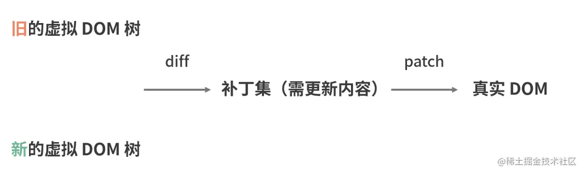 注:图中的 diff 和 patch 其实都是函数名,这些函数取材于一个独立的虚拟 DOM 库。之所以写明了具体流程对应的函数名,是因为我发现面试的时候,很多面试官习惯于用函数名指代过程,但不少人不清楚这个对应关系(尤其是 patch),会非常影响作答。这里提前帮你把这个坑给规避掉。