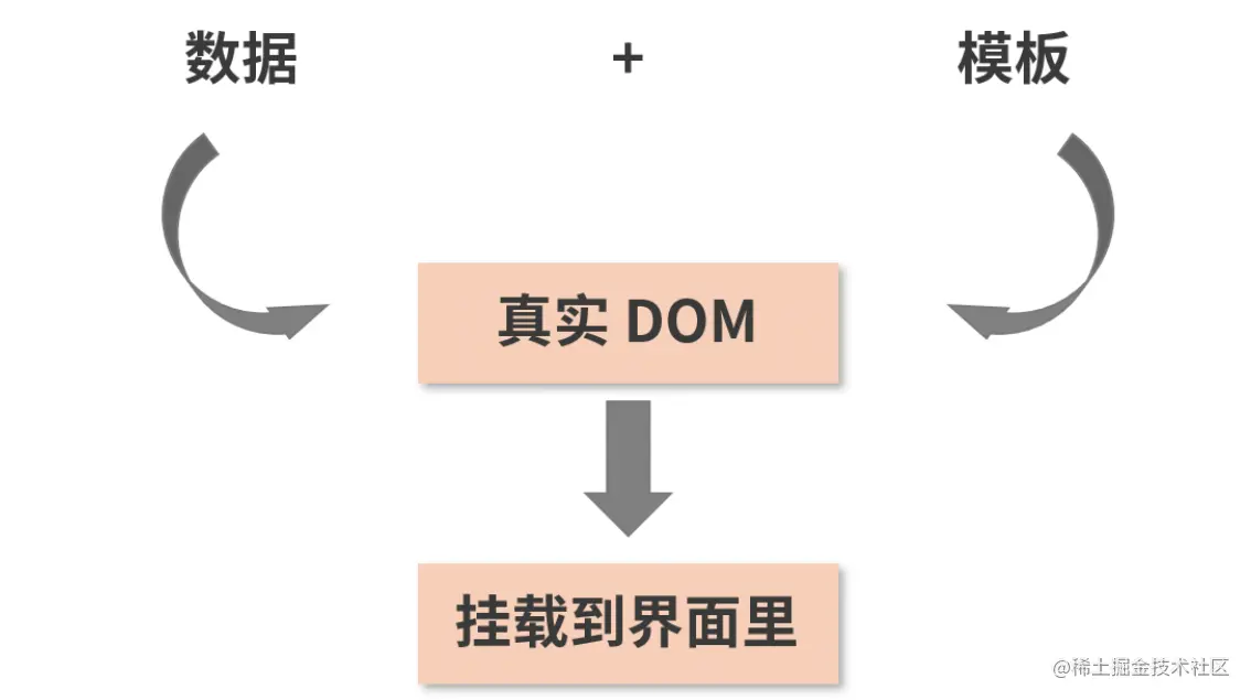 注意图中的“模板”二字加了引号,这是因为虚拟 DOM 在实现上并不总是借助模板。比如 React 就使用了 JSX,前面咱们着重讲过,JSX 本质不是模板,而是一种使用体验和模板相似的 JS 语法糖。