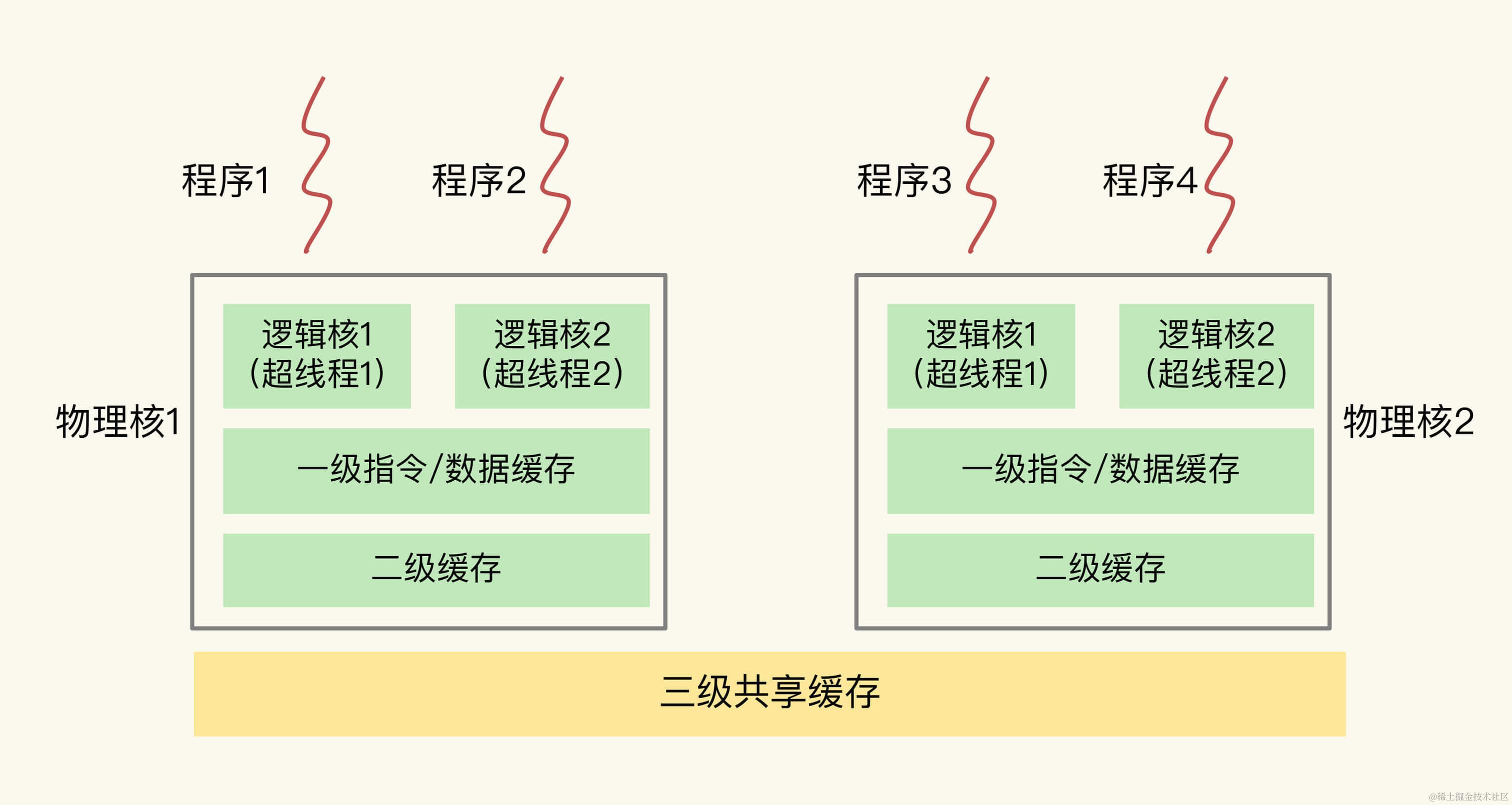一个CPU处理器中一般有多个运行核心,我们把一个运行核心称为一个物理核,每个物理核都可以运行应用程序。每个物理核都拥有私有的一级缓存(Level 1 cache,简称L1 cache),包括一级指令缓存和一级数据缓存,以及私有的二级缓存(Level 2 cache,简称L2 cache)。