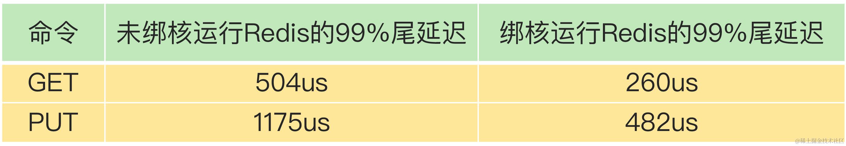 绑定以后,我们进行了测试。我们发现,Redis实例的GET和PUT的99%尾延迟一下子就分别降到了260微秒和482微秒,达到了我们期望的目标。