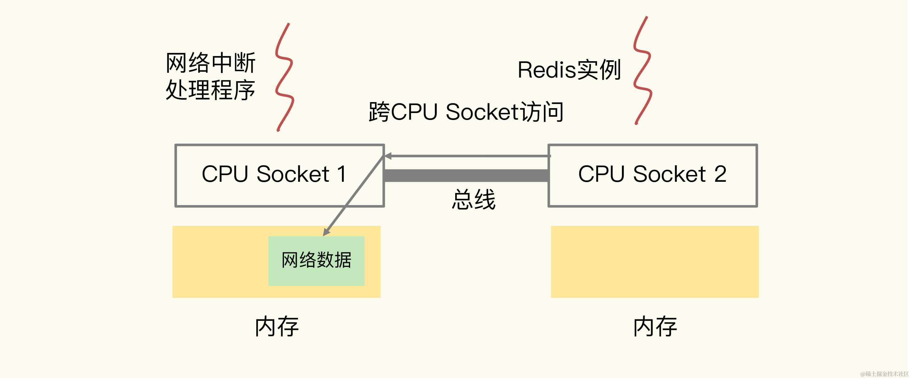 可以看到,图中的网络中断处理程序被绑在了CPU Socket 1的某个核上,而Redis实例则被绑在了CPU Socket 2上。此时,网络中断处理程序读取到的网络数据,被保存在CPU Socket 1的本地内存中,当Redis实例要访问网络数据时,就需要Socket 2通过总线把内存访问命令发送到 Socket 1上,进行远程访问,时间开销比较大。