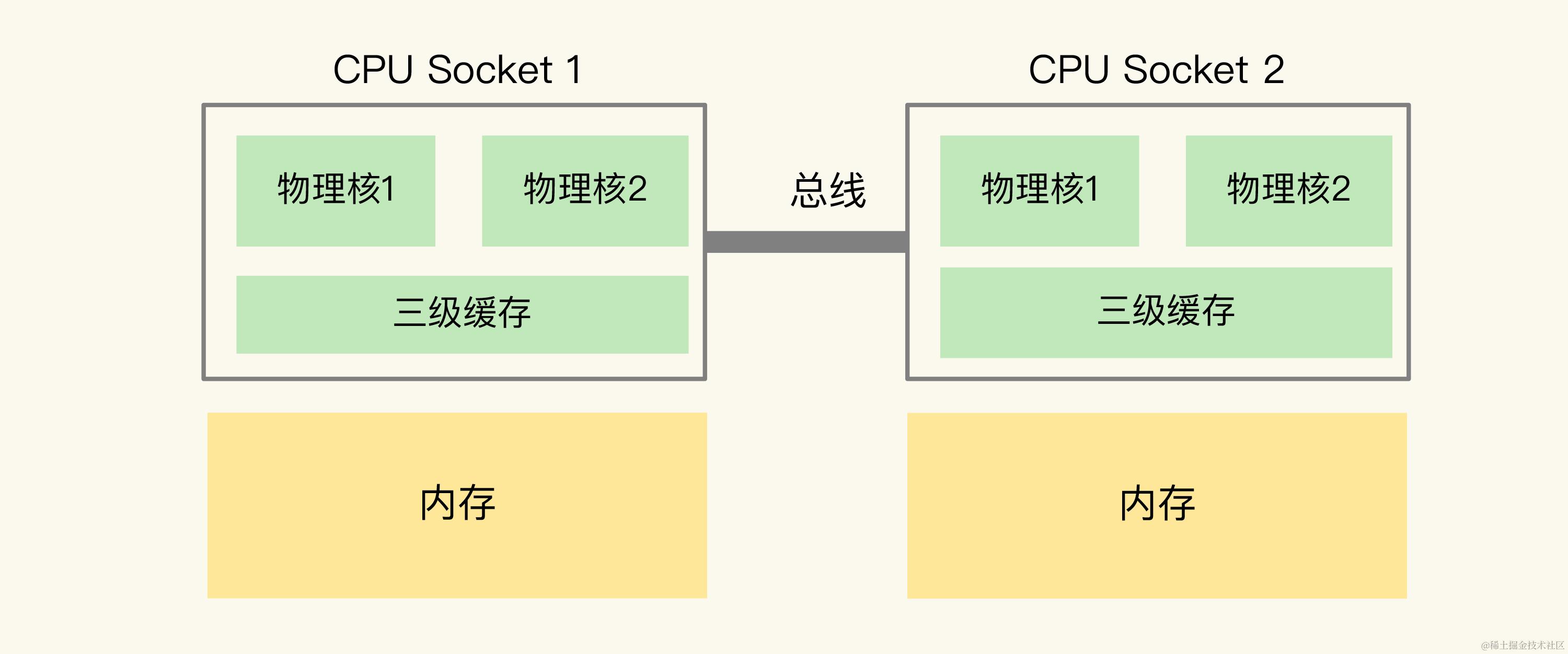 在主流的服务器上,一个CPU处理器会有10到20多个物理核。同时,为了提升服务器的处理能力,服务器上通常还会有多个CPU处理器(也称为多CPU Socket),每个处理器有自己的物理核(包括L1、L2缓存),L3缓存,以及连接的内存,同时,不同处理器间通过总线连接。