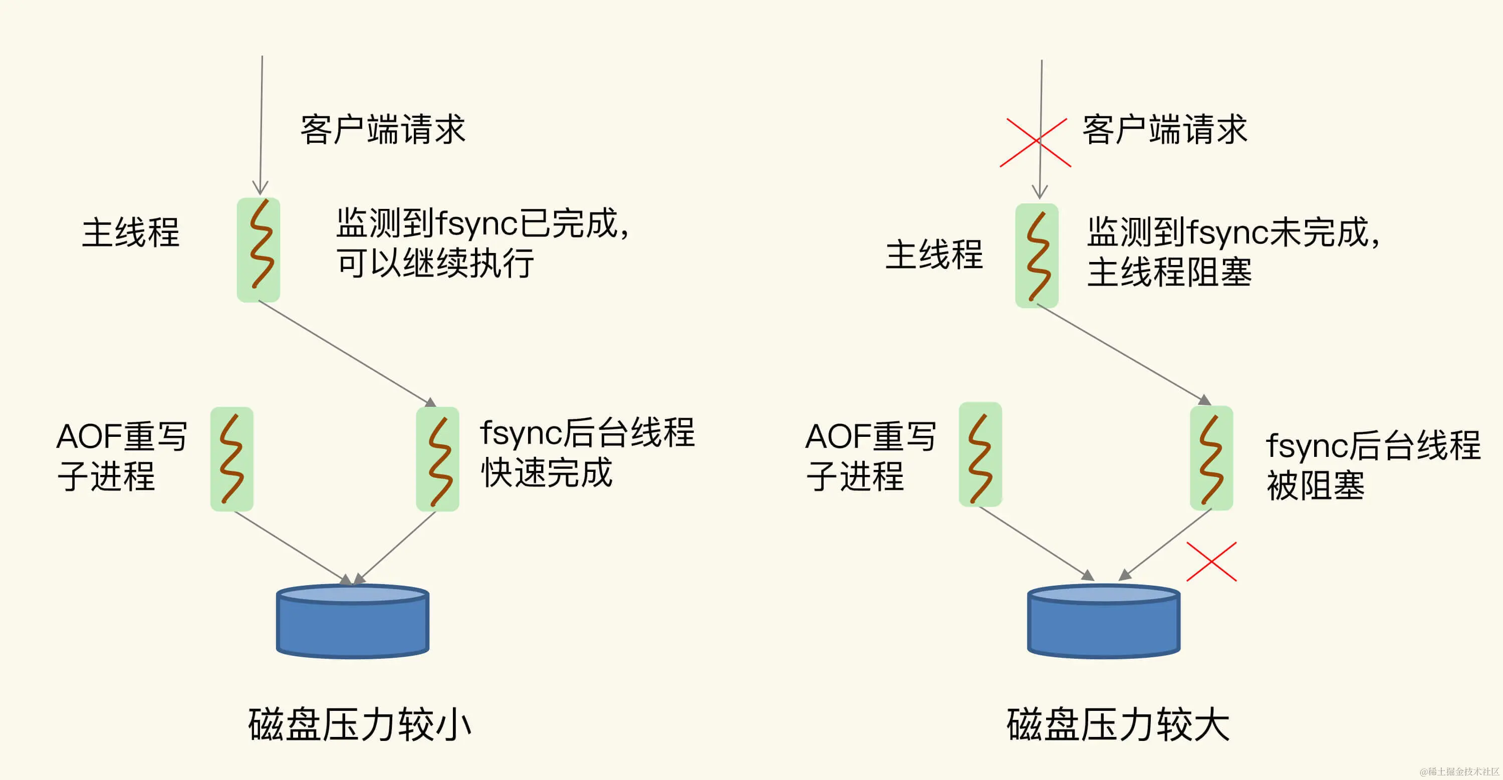 为了帮助你理解,我再画一张图来展示下在磁盘压力小和压力大的时候,fsync后台子线程和主线程受到的影响。