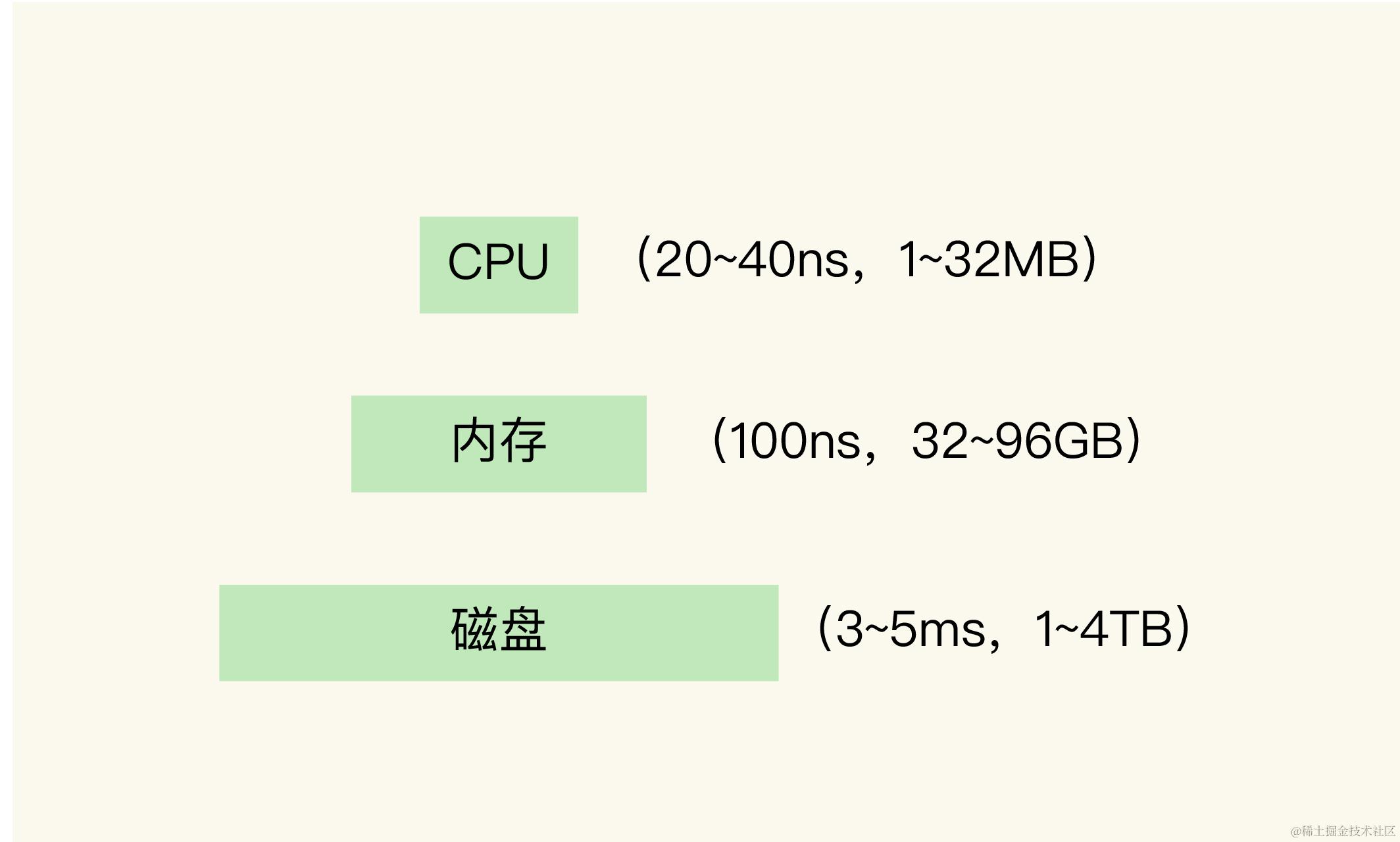 从图上可以看到,CPU、内存和磁盘这三层的访问速度从几十ns到100ns,再到几ms,性能的差异很大。