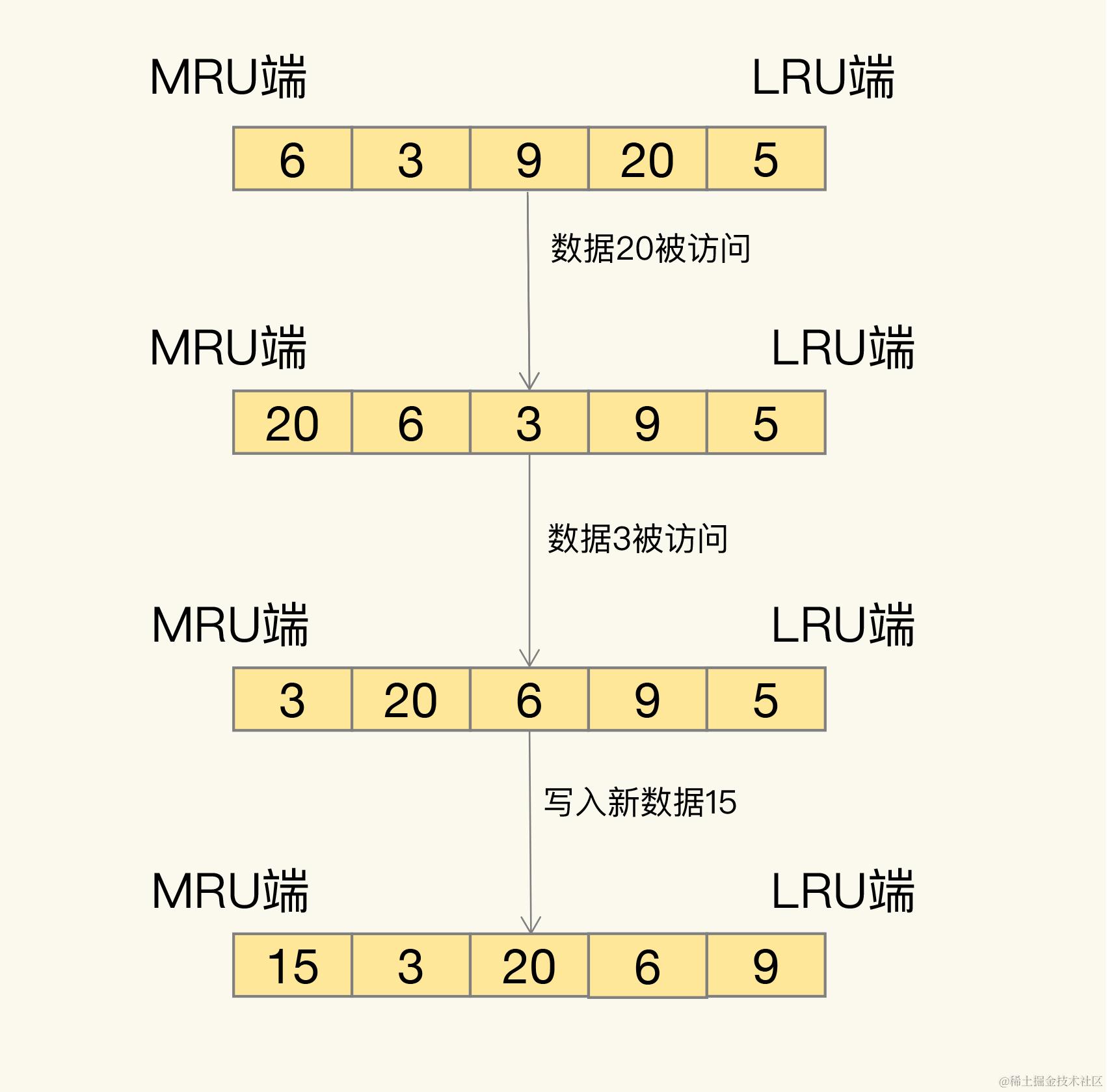 - 数据15是刚被访问的,所以它会被放到MRU端;