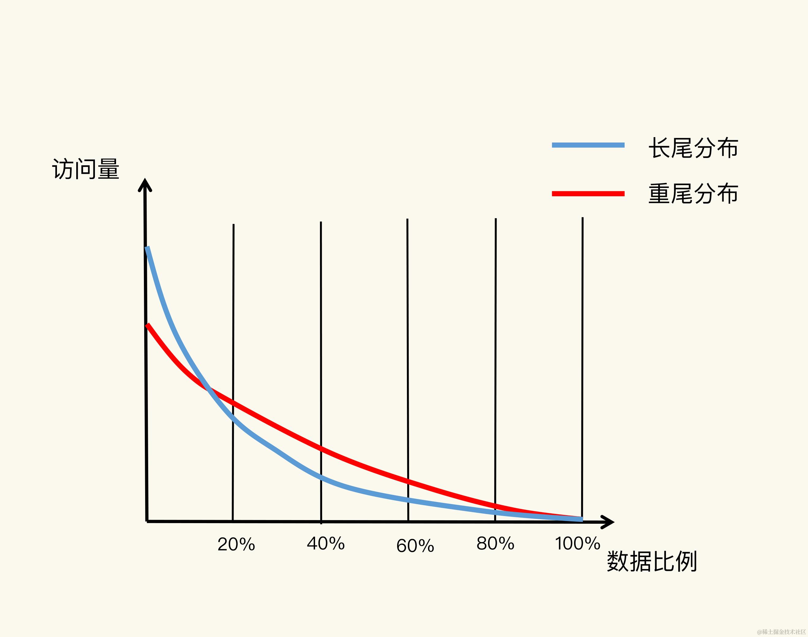 在这条红线上,80%的数据贡献的访问量,超过了传统的长尾效应中80%数据能贡献的访问量。原因在于,用户的个性化需求越来越多,在一个业务应用中,不同用户访问的内容可能差别很大,所以,用户请求的数据和它们贡献的访问量比例,不再具备长尾效应中的“八二原理”分布特征了。也就是说,20%的数据可能贡献不了80%的访问,而剩余的80%数据反而贡献了更多的访问量,我们称之为重尾效应。