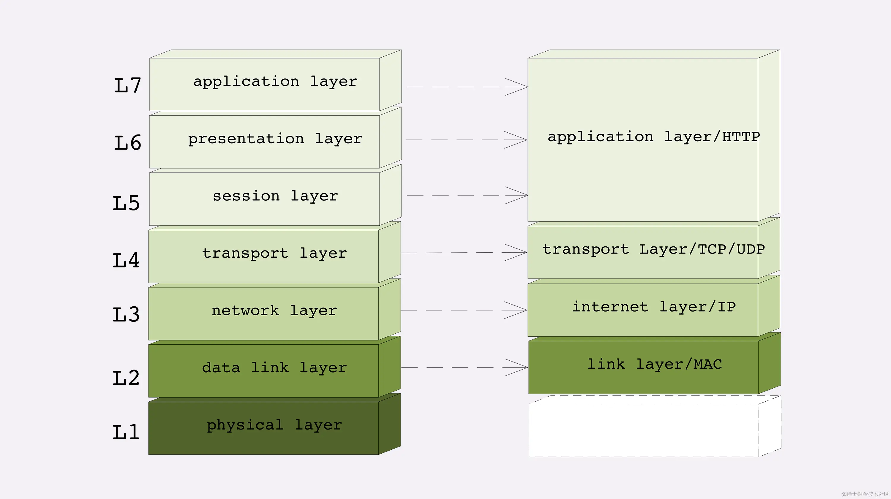 - 日常交流的时候我们通常使用 OSI 模型,用四层、七层等术语;