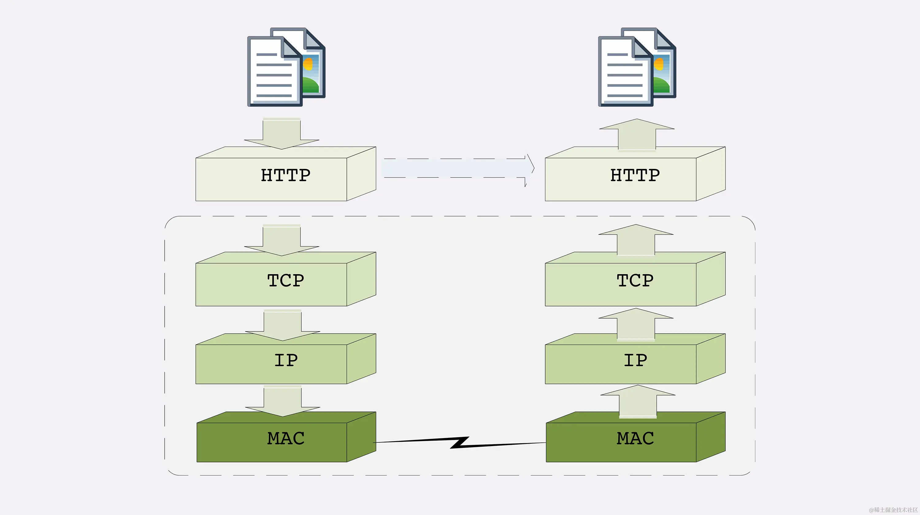 之后经过漫长的运输,包裹到达目的地,要卸货再放进另一位快递员的三轮车,就是在 IP 层、MAC 层传输后拆包。
