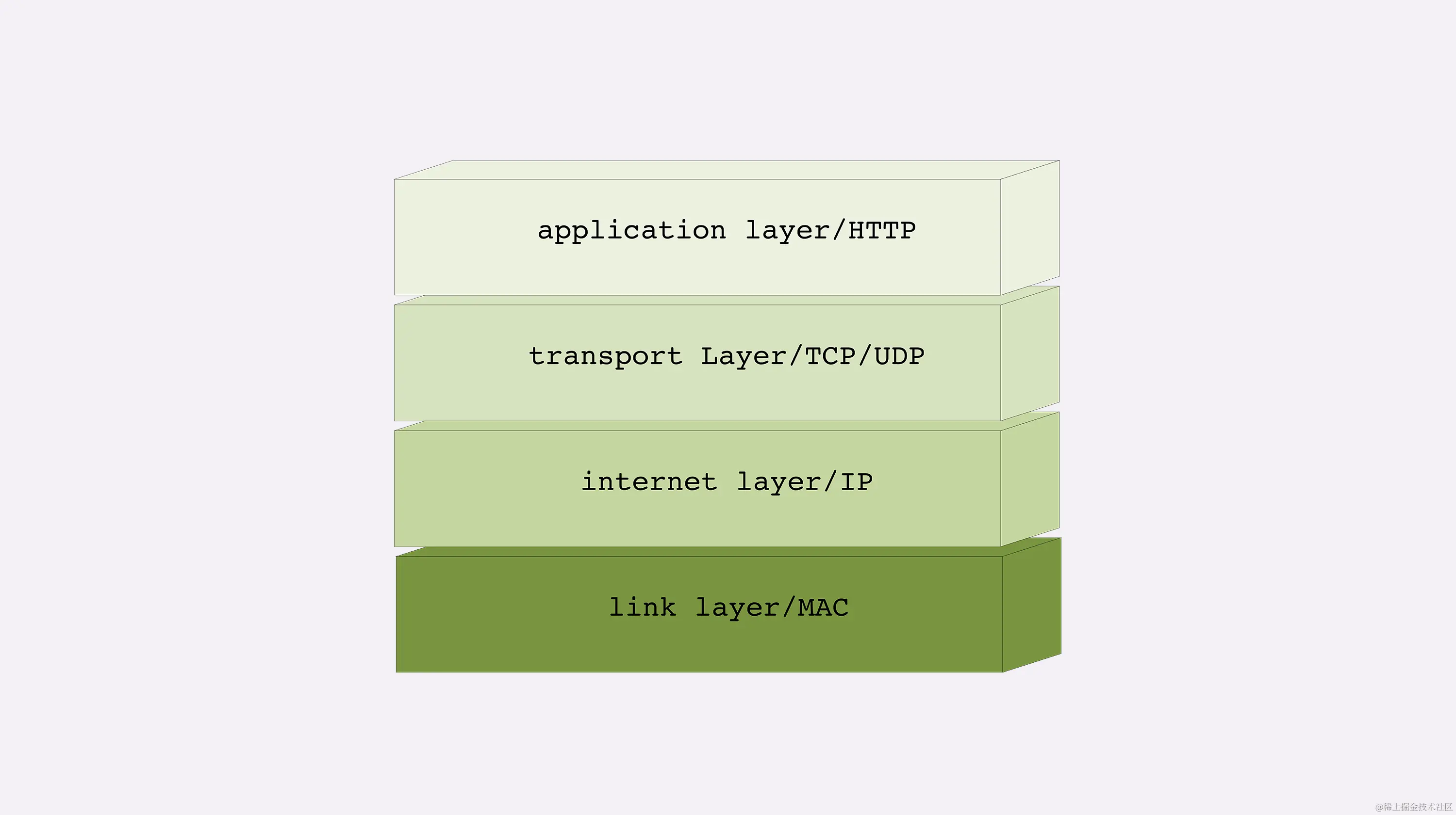 第一层叫“链接层”(link layer),负责在以太网、WiFi 这样的底层网络上发送原始数据包,工作在网卡这个层次,使用 MAC 地址来标记网络上的设备,所以有时候也叫 MAC 层。