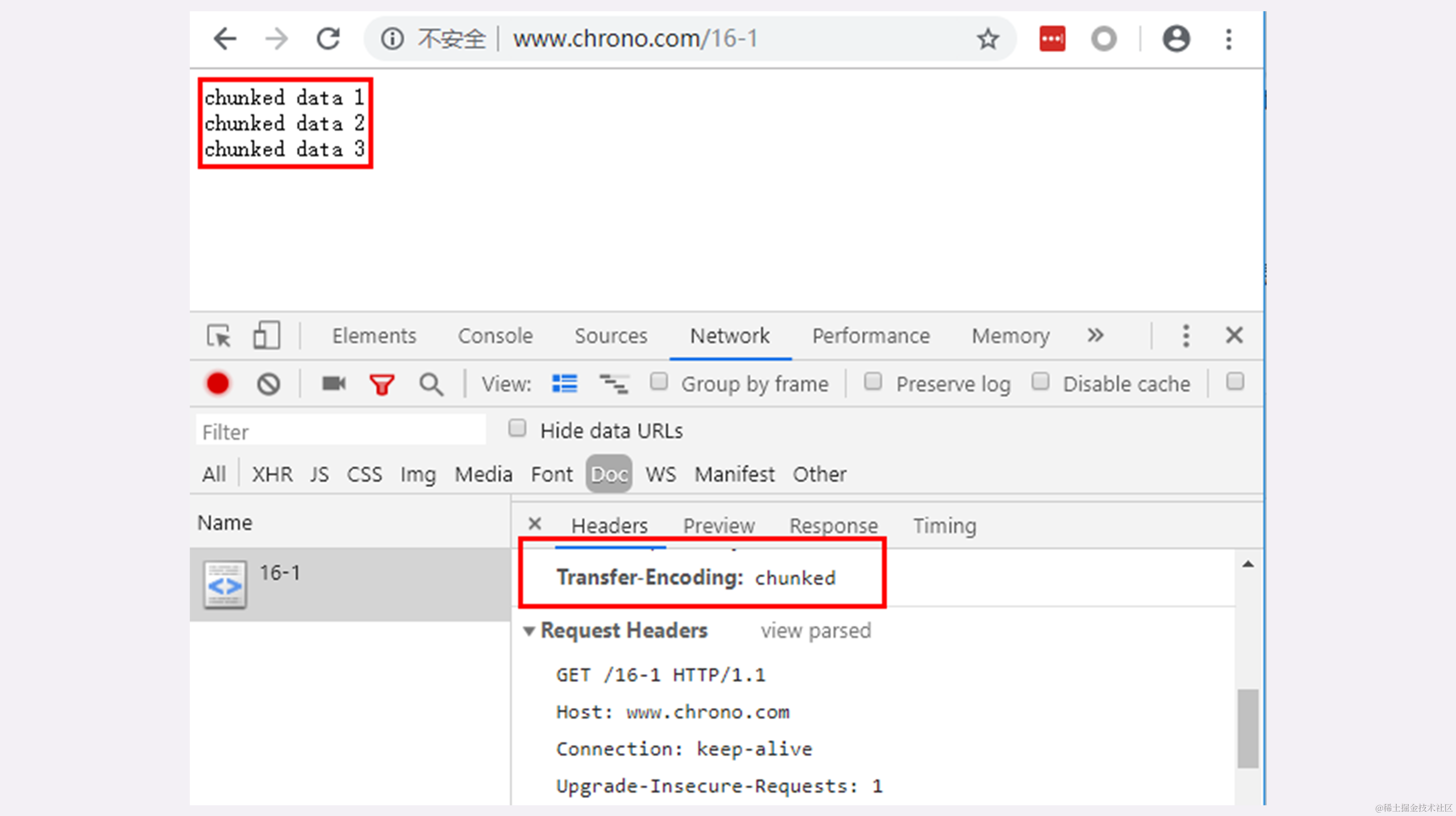 实验环境里的 URI“/16-1”简单地模拟了分块传输,可以用 Chrome 访问这个地址看一下效果: