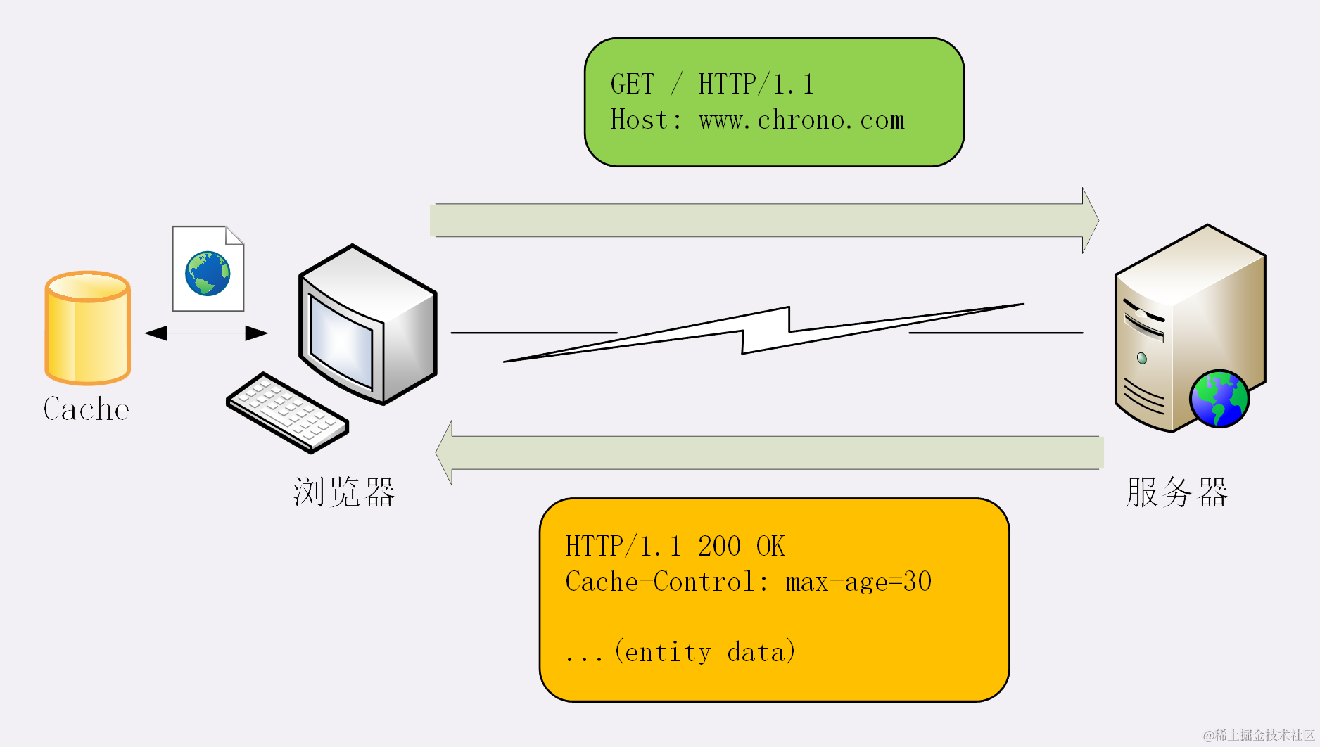 在这个场景里,“生鲜超市”就是 Web 服务器,“你”就是浏览器,“冰箱”就是浏览器内部的缓存。整个流程翻译成 HTTP 就是: