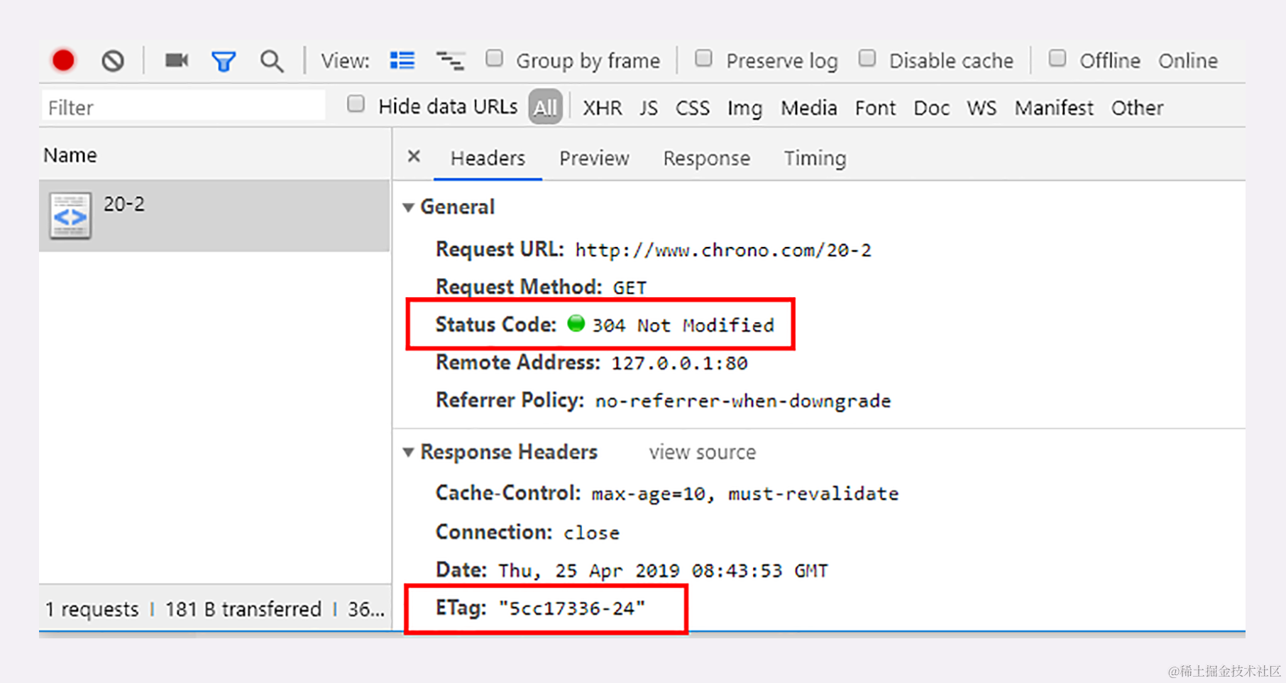 再来看看实验环境的 URI “/20-2”。它为资源增加了 ETag 字段,刷新页面时浏览器就会同时发送缓存控制头“max-age=0”和条件请求头“If-None-Match”,如果缓存有效服务器就会返回 304:
