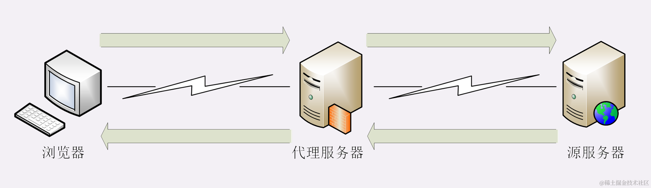 在前面讲 HTTP 协议的时候,我们严格遵循了 HTTP 的“请求 - 应答”模型,协议中只有两个互相通信的角色,分别是“请求方”浏览器(客户端)和“应答方”服务器。