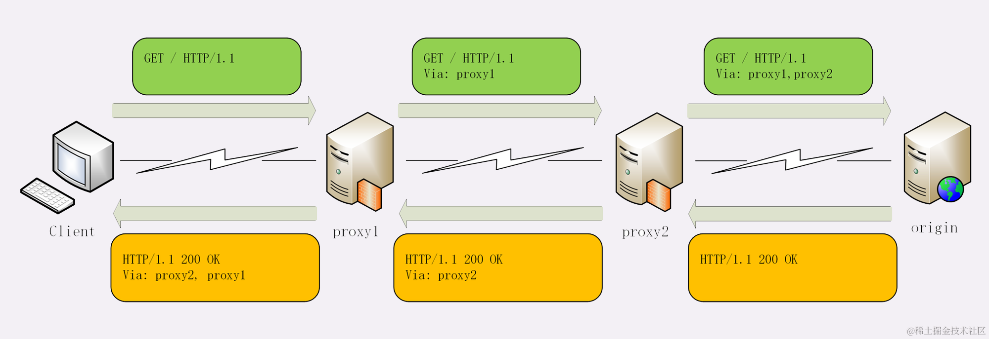 例如下图中有两个代理:proxy1 和 proxy2,客户端发送请求会经过这两个代理,依次添加就是“Via: proxy1, proxy2”,等到服务器返回响应报文的时候就要反过来走,头字段就是“Via: proxy2, proxy1”。