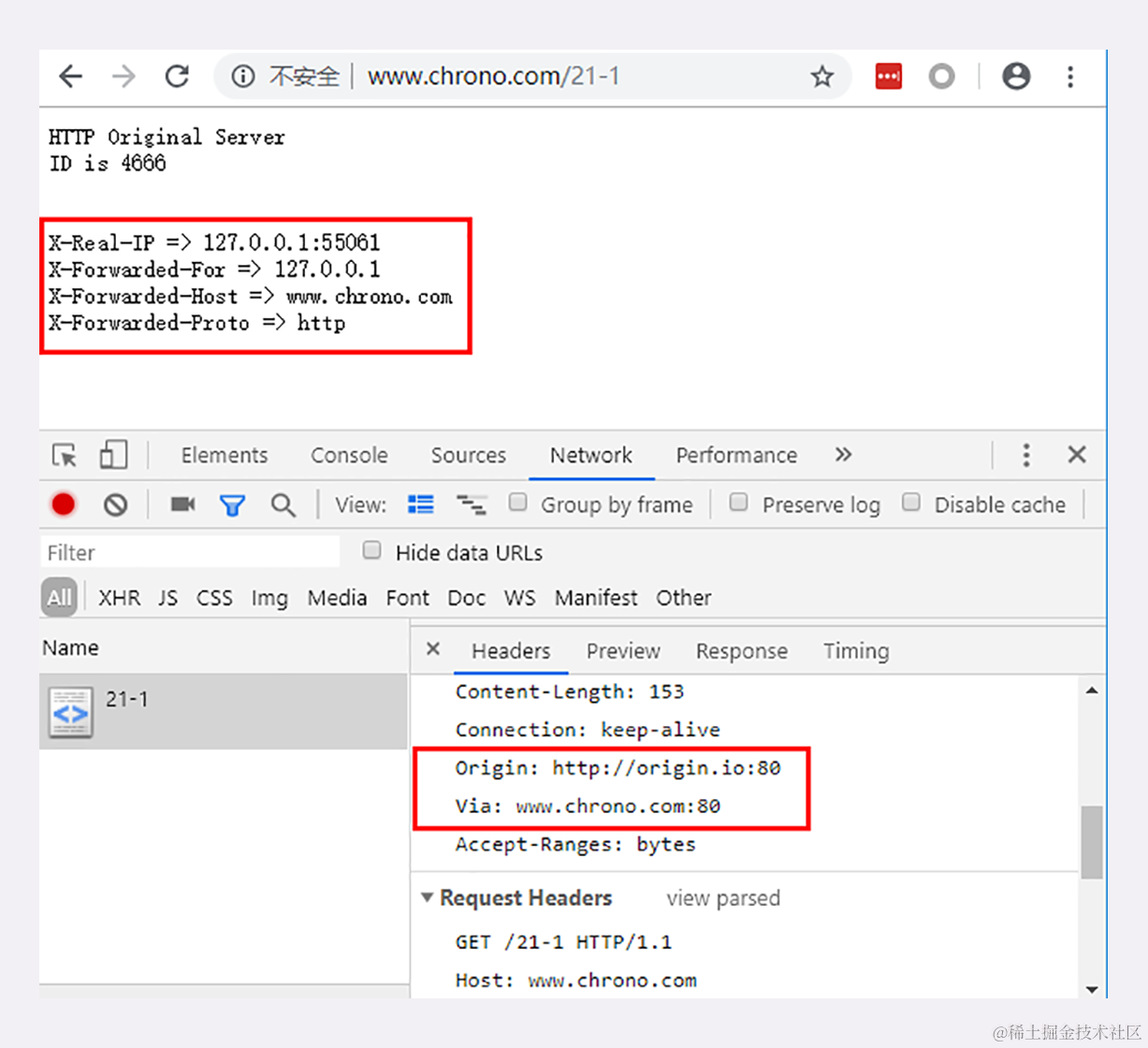 我们的实验环境实现了一个反向代理,访问 http:// www.chrono.com/21-1,它会转而访问…: //origin.io。这里的“origin.io”就是源站,它会在响应报文里输出“Via”“X-Forwarded-For”等代理头字段信息: