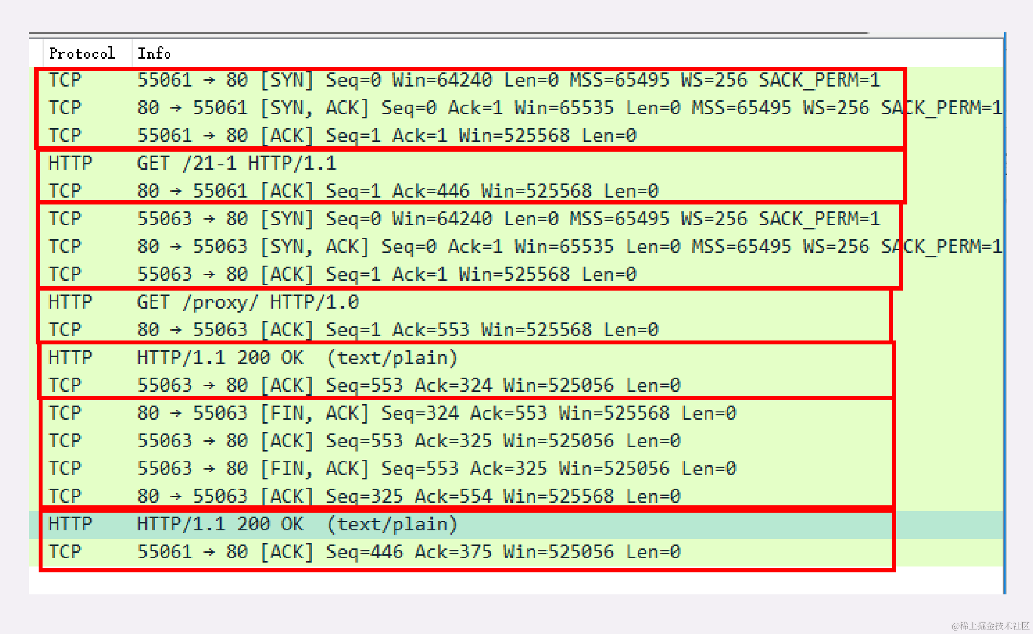 - 客户端 55061 先用三次握手连接到代理的 80 端口,然后发送 GET 请求;