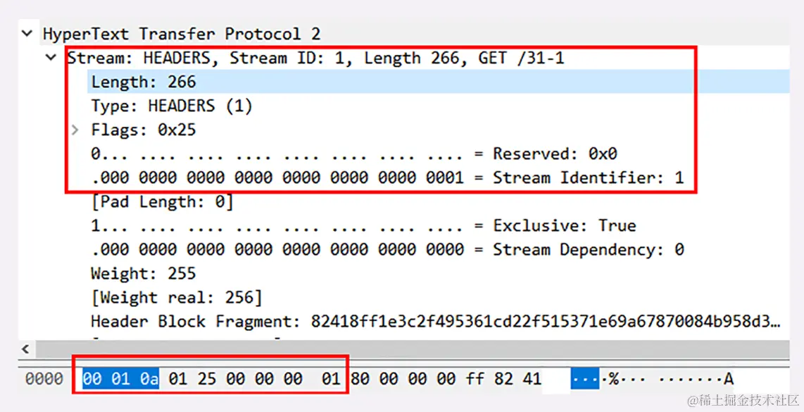 最后 4 个字节的流标识符是整数 1,表示这是客户端发起的第一个流,后面的响应数据帧也会是这个 ID,也就是说在 stream[1] 里完成这个请求响应。