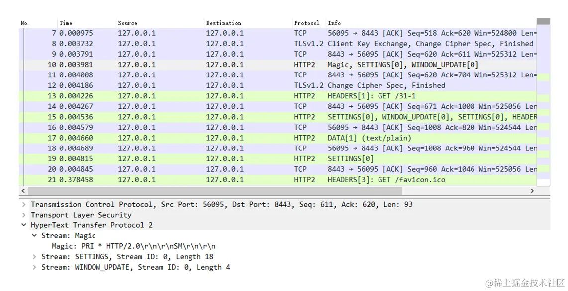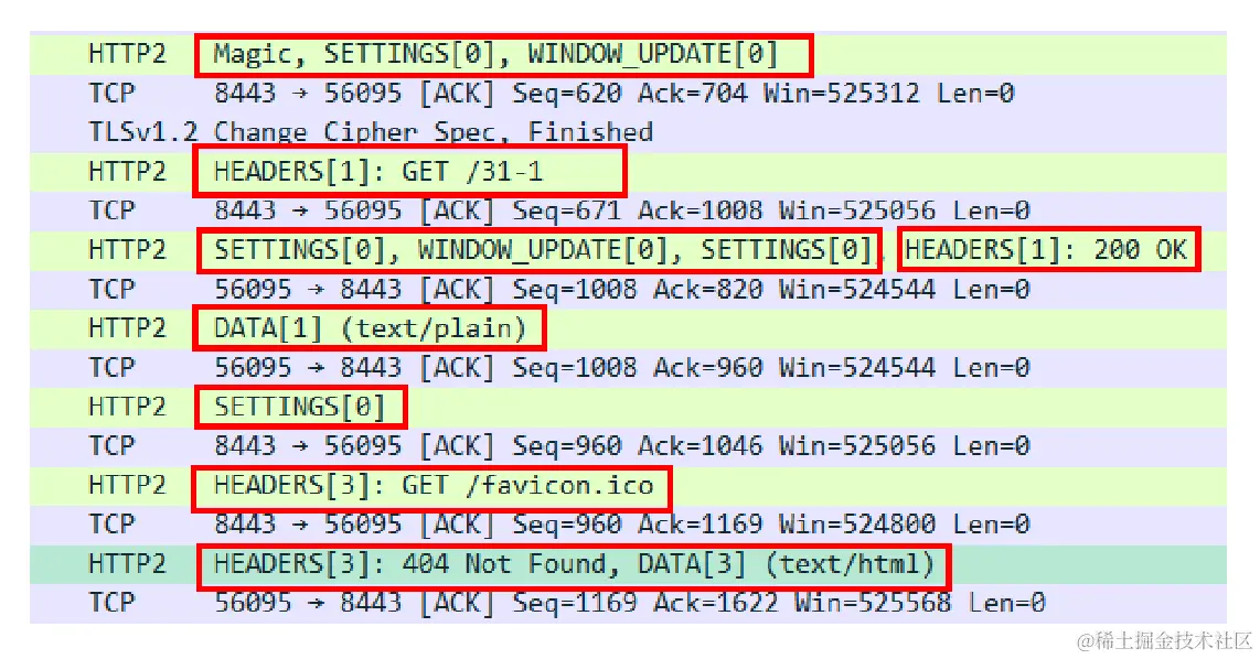 所以,就不要问“为什么会是这样”了,只要服务器收到这个“有魔力的字符串”,就知道客户端在 TLS 上想要的是 HTTP/2 协议,而不是其他别的协议,后面就会都使用 HTTP/2 的数据格式。