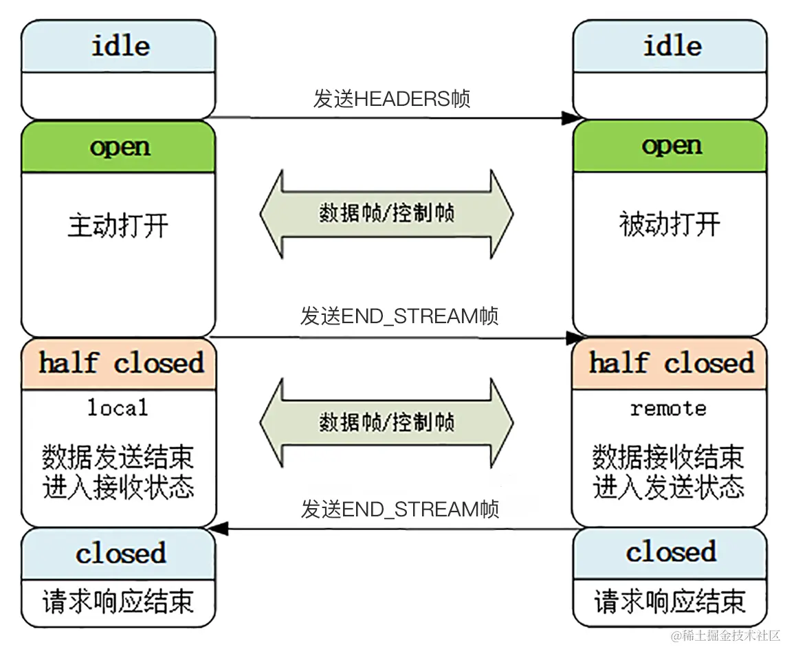 当客户端发送 HEADERS 帧后,有了流 ID,流就进入了“打开”状态,两端都可以收发数据,然后客户端发送一个带“END_STREAM”标志位的帧,流就进入了“半关闭”状态。