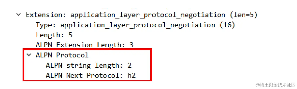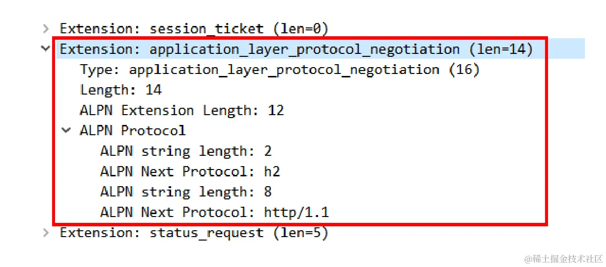 客户端在发起“Client Hello”握手的时候,后面会带上一个“ALPN”扩展,里面按照优先顺序列出客户端支持的应用协议。