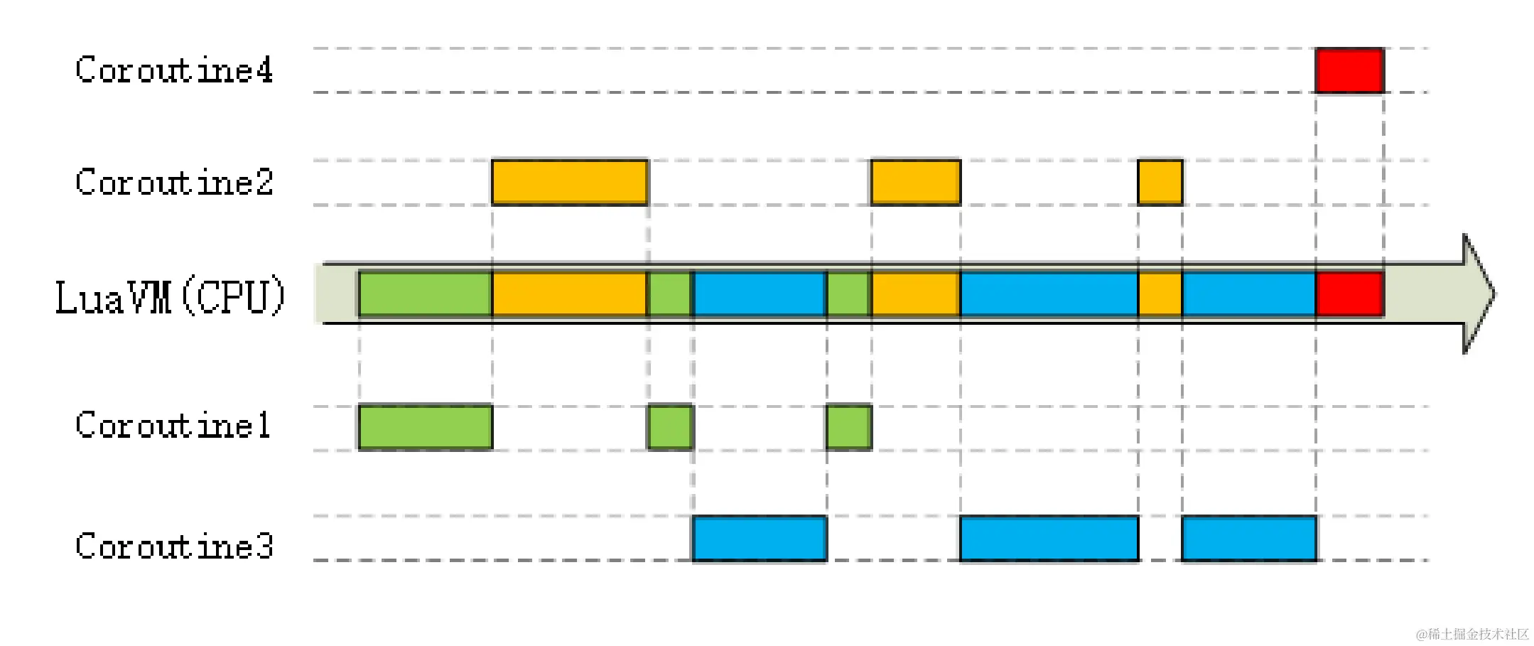 OpenResty 里每一段 Lua 程序都由协程来调度运行。和 Linux 的 epoll 一样,每当可能发生阻塞的时候“协程”就会立刻切换出去,执行其他的程序。这样单个处理流程是“阻塞”的,但整个 OpenResty 却是“非阻塞的”,多个程序都“复用”在一个 Lua 虚拟机里运行。