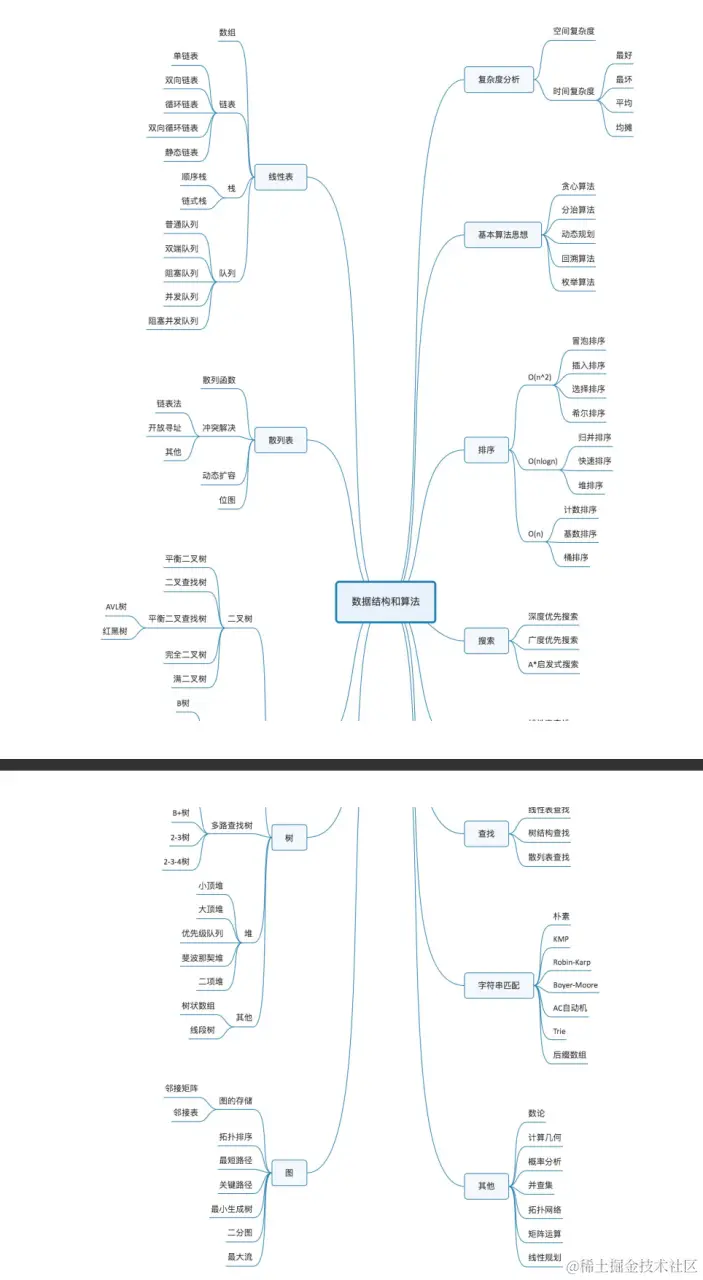 为了让你对数据结构和算法能有个全面的认识,我画了一张图,里面几乎涵盖了所有数据结构和算 法书籍中都会讲到的知识点。