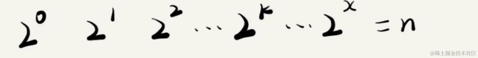 从代码中可以看出,变量 i 的值从 1 开始取,每循环一次就乘以 2。当大于 n 时,循环结束。还记得我们高中学过的等比数列吗?实际上,变量 i 的取值就是一个等比数列。如果我把它一个一个列出来,就应该是这个样子的: