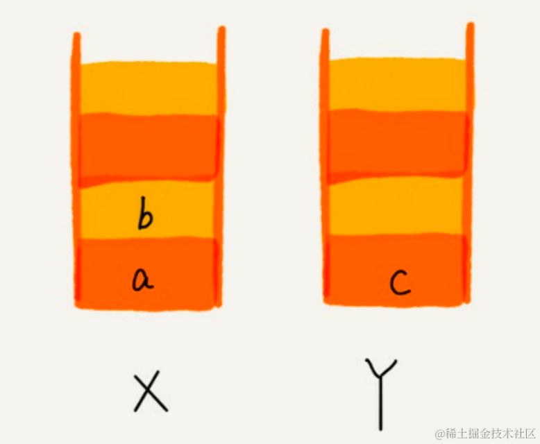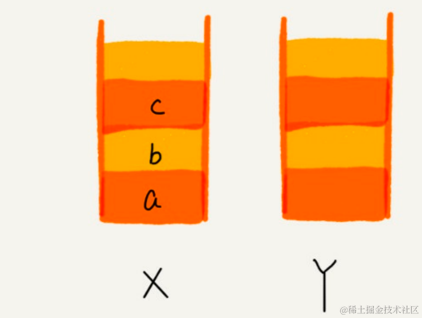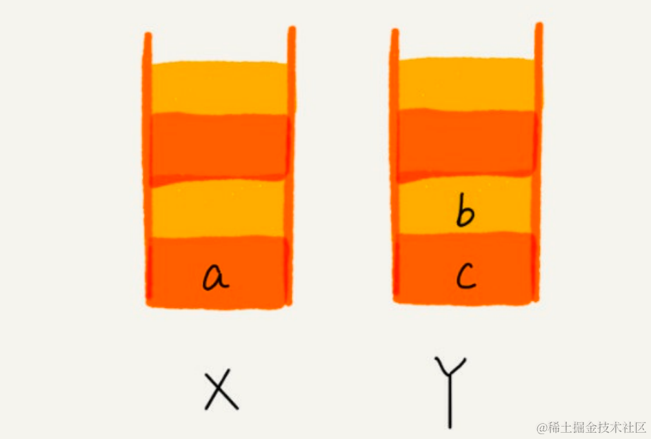 当你通过浏览器的后退按钮,从页面 c 后退到页面 a 之后,我们就依次把 c 和 b 从栈 X 中弹出,并且依次放入到栈 Y。这个时候,两个栈的数据就是这个样子:
