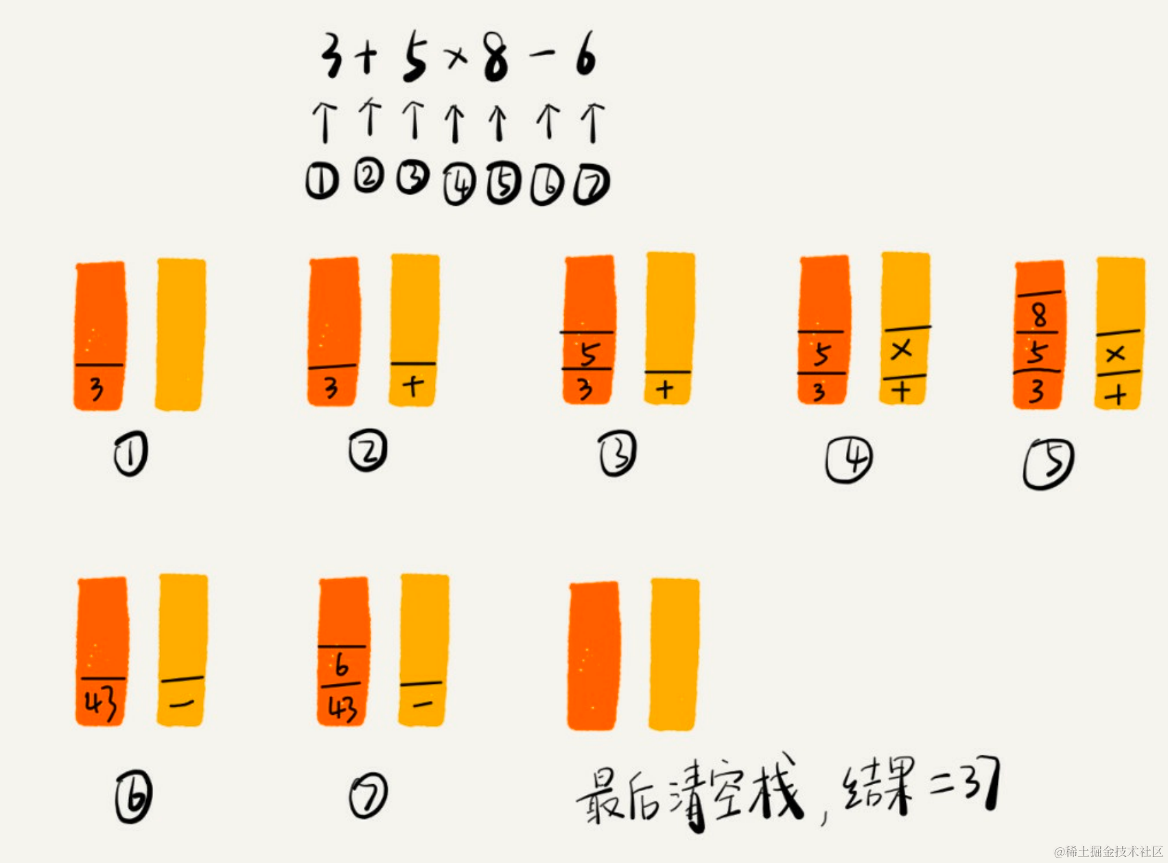 如果比运算符栈顶元素的优先级高,就将当前运算符压入栈;如果比运算符栈顶元素的优先级低或者相同,从运算符栈中取栈顶运算符,从操作数栈的栈顶取 2 个操作数,然后进行计算,再把计算完的结果压入操作数栈,继续比较。我将 3+5*8-6 这个表达式的计算过程画成了一张图,你可以结合图来理解我刚讲的计算过程。
