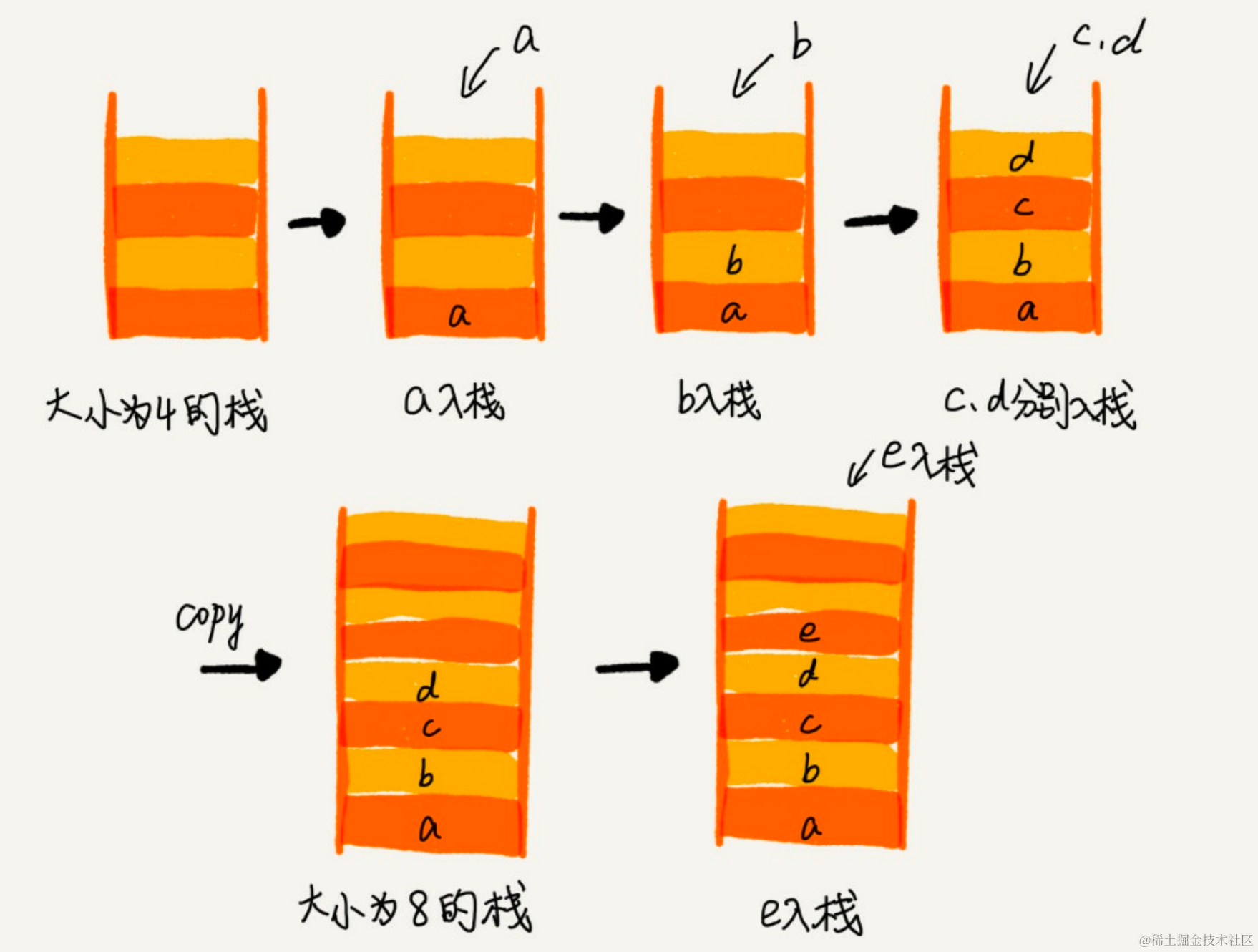 你还记得,我们在数组那一节,是如何来实现一个支持动态扩容的数组的吗?当数组空间不够时,我们就重新申请一块更大的内存,将原来数组中数据统统拷贝过去。这样就实现了一个支持动态扩容的数组。所以,如果要实现一个支持动态扩容的栈,我们只需要底层依赖一个支持动态扩容的数组就可以了。当栈满了之后,我们就申请一个更大的数组,将原来的数据搬移到新数组中。我画了一张图,你可以对照着理解一下。
