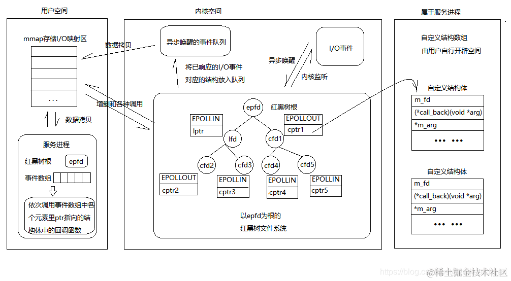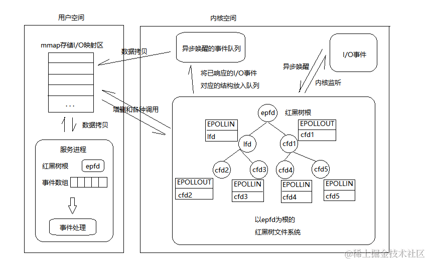 - 执行 epoll_ctl() 时,如果增加 socket 句柄,则检查在红黑树中是否存在,存在立即返回,不存在则添加到树干上,然后向内核注册回调函数,用于当中断事件来临时向准备就绪链表中插入数据;