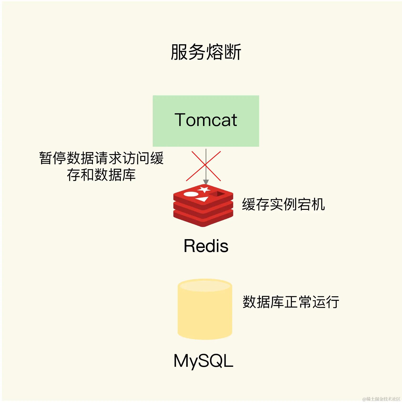在业务系统运行时,我们可以监测Redis缓存所在机器和数据库所在机器的负载指标,例如每秒请求数、CPU利用率、内存利用率等。如果我们发现Redis缓存实例宕机了,而数据库所在机器的负载压力突然增加(例如每秒请求数激增),此时,就发生缓存雪崩了。大量请求被发送到数据库进行处理。我们可以启动服务熔断机制,暂停业务应用对缓存服务的访问,从而降低对数据库的访问压力,如下图所示: