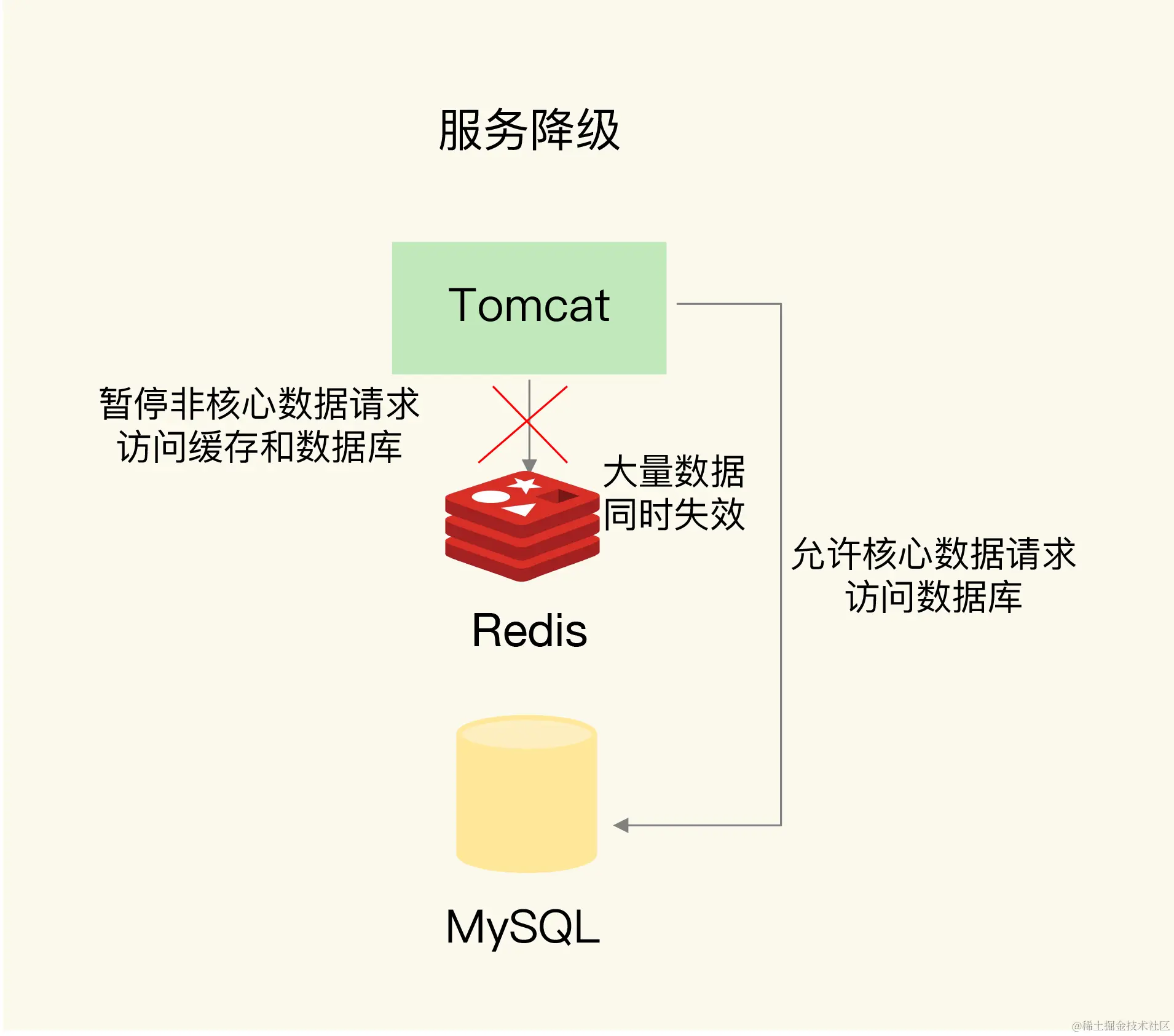 除了微调过期时间,我们还可以通过服务降级,来应对缓存雪崩。