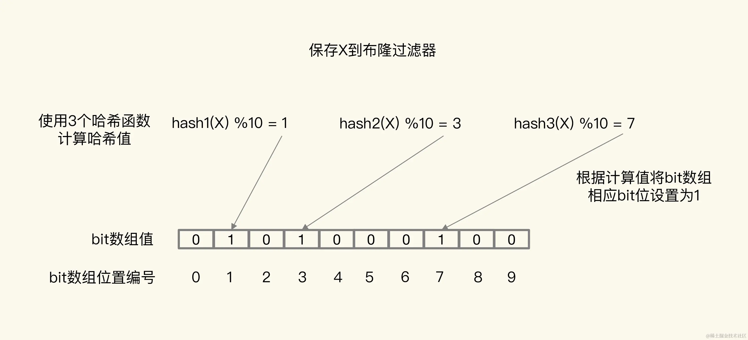 图中布隆过滤器是一个包含10个bit位的数组,使用了3个哈希函数,当在布隆过滤器中标记数据X时,X会被计算3次哈希值,并对10取模,取模结果分别是1、3、7。所以,bit数组的第1、3、7位被设置为1。当应用想要查询X时,只要查看数组的第1、3、7位是否为1,只要有一个为0,那么,X就肯定不在数据库中。
