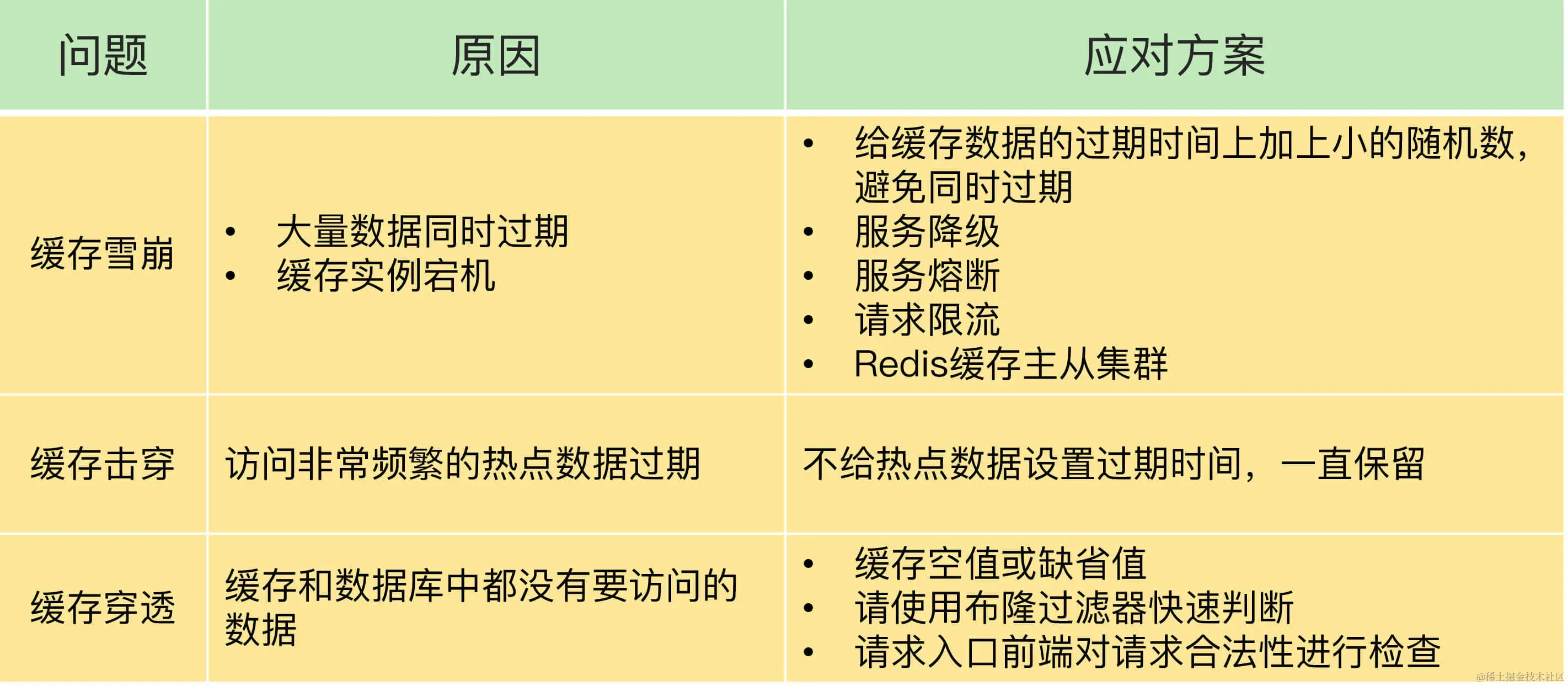 - 针对缓存雪崩,合理地设置数据过期时间,以及搭建高可靠缓存集群;