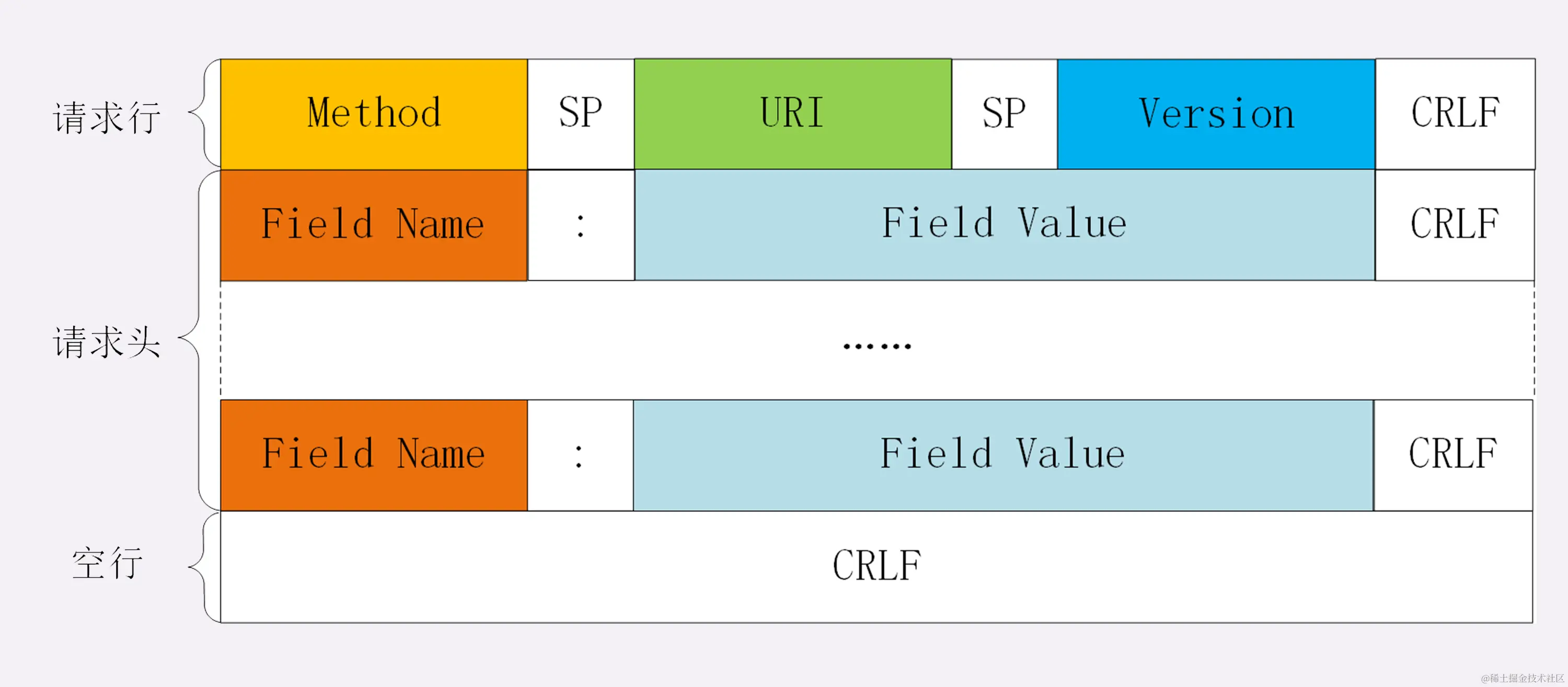 - 头部字段是 key-value 的形式,用“:”分隔,不区分大小写,顺序任意,除了规定的标准头,也可以任意添加自定义字段,实现功能扩展;