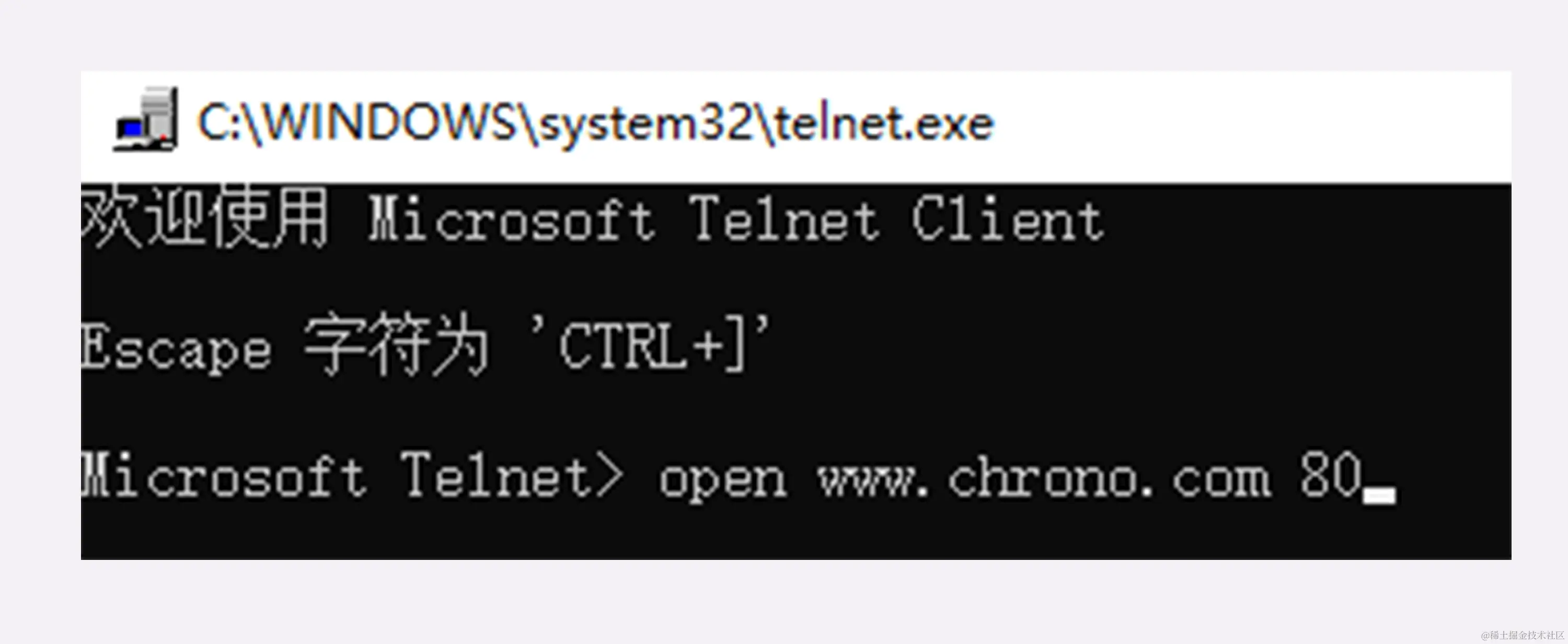 先启动 OpenResty 服务器,然后用组合键“Win+R”运行 telnet,输入命令“open www.chrono.com 80”,就连上了 Web 服务器。