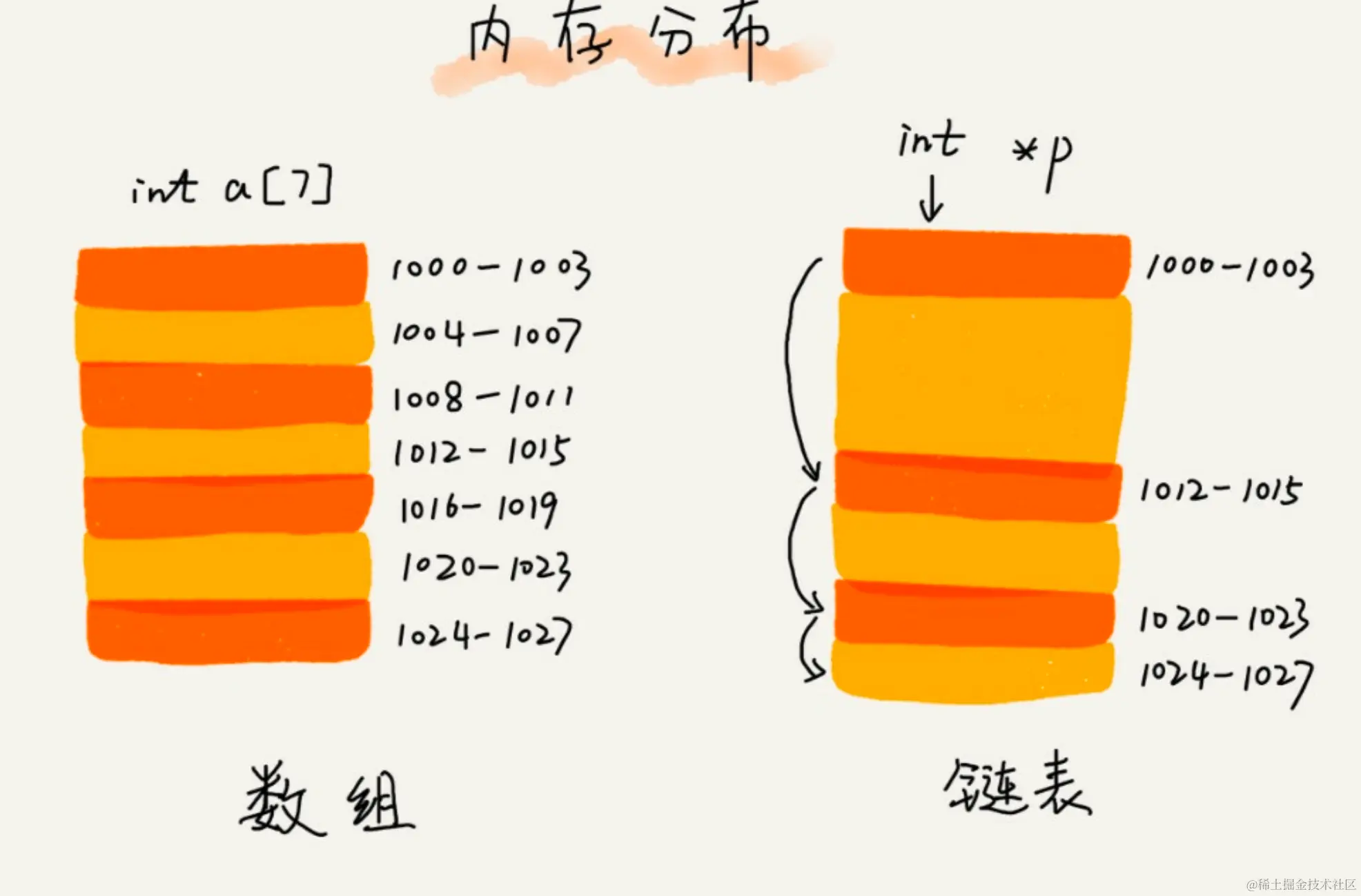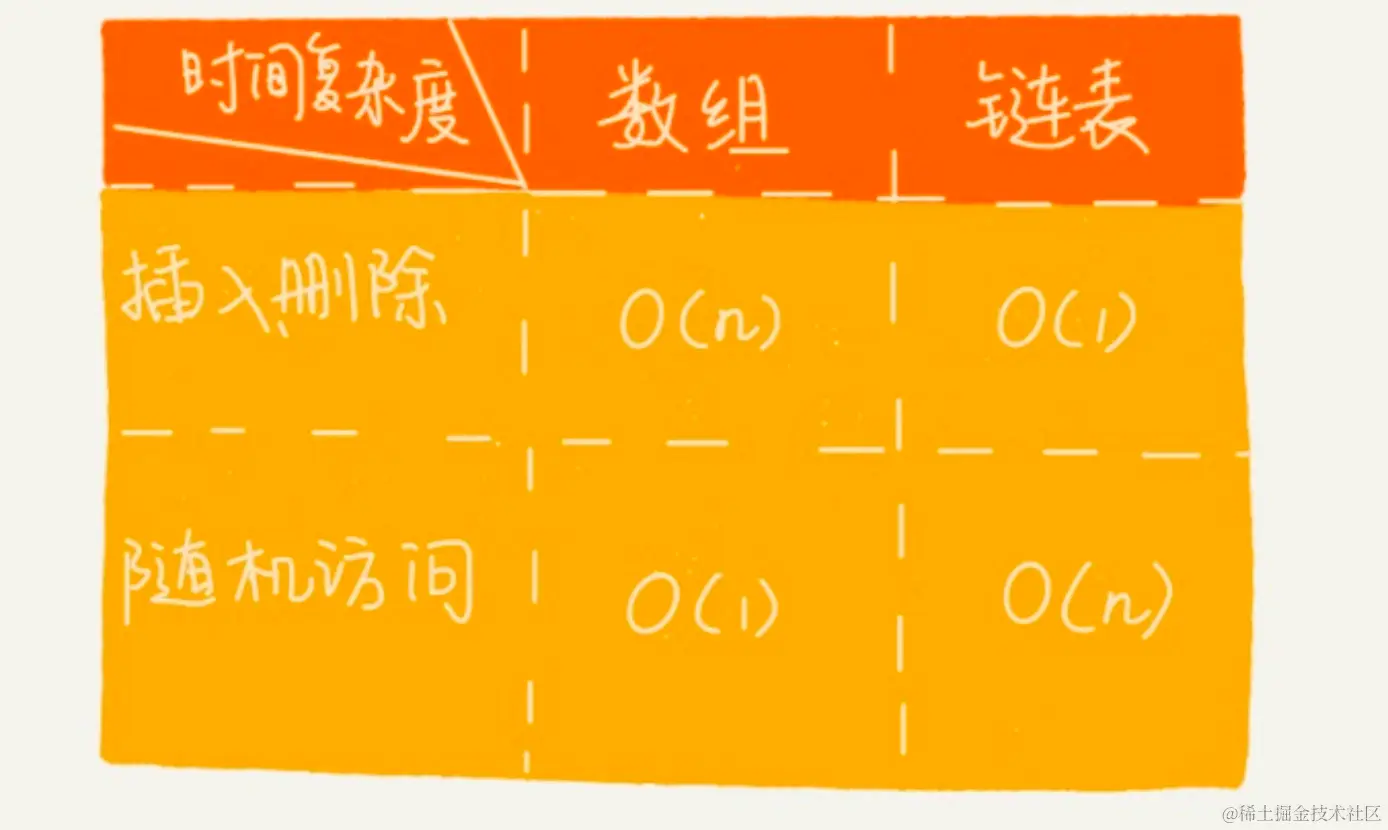 通过前面内容的学习,你应该已经知道,数组和链表是两种截然不同的内存组织方式。正是因为内存存储的区别,它们插入、删除、随机访问操作的时间复杂度正好相反。
