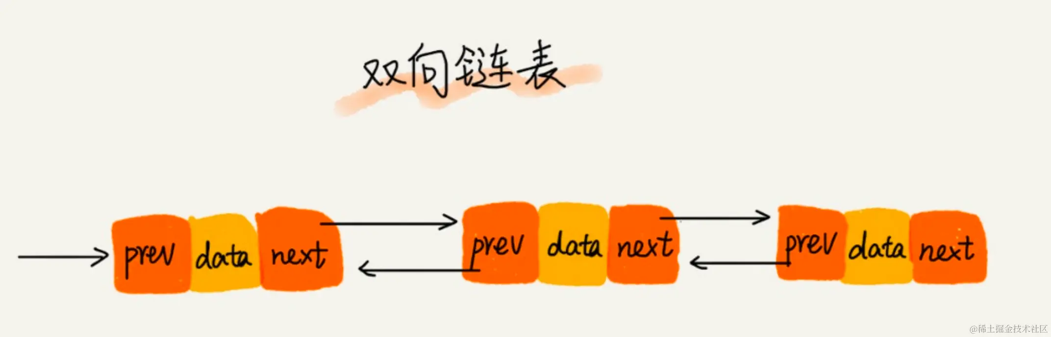 单链表和循环链表是不是都不难?接下来我们再来看一个稍微复杂的,在实际的软件开发中,也更加常用的链表结构:双向链表。