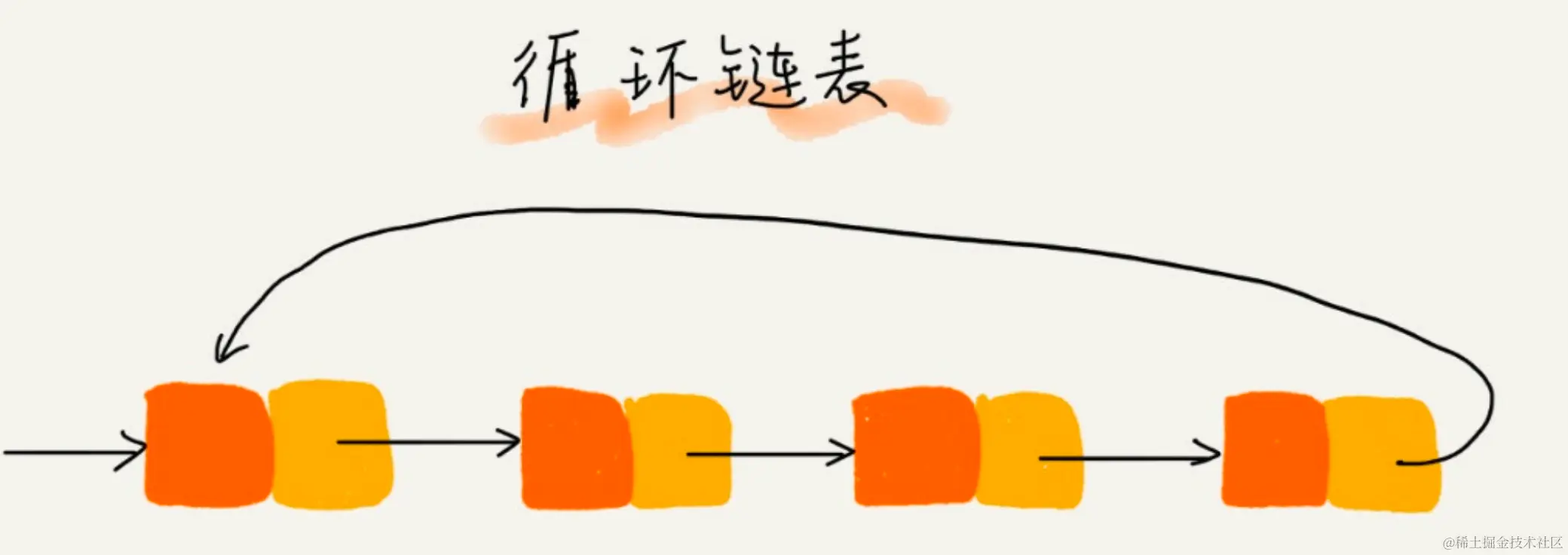 好了,单链表我们就简单介绍完了,接着来看另外两个复杂的升级版,循环链表和双向链表。循环链表是一种特殊的单链表。实际上,循环链表也很简单。它跟单链表唯一的区别就在尾结点。