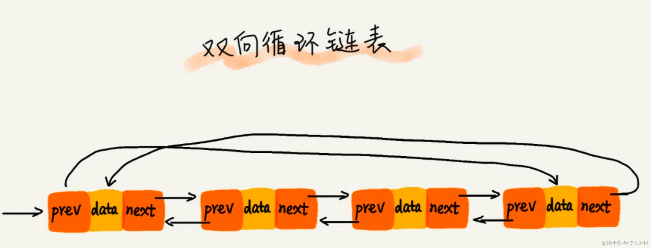 了解了循环链表和双向链表,如果把这两种链表整合在一起就是一个新的版本:双向循环链表。我想不用我多讲,你应该知道双向循环链表长什么样子了吧?你可以自己试着在纸上画一画。