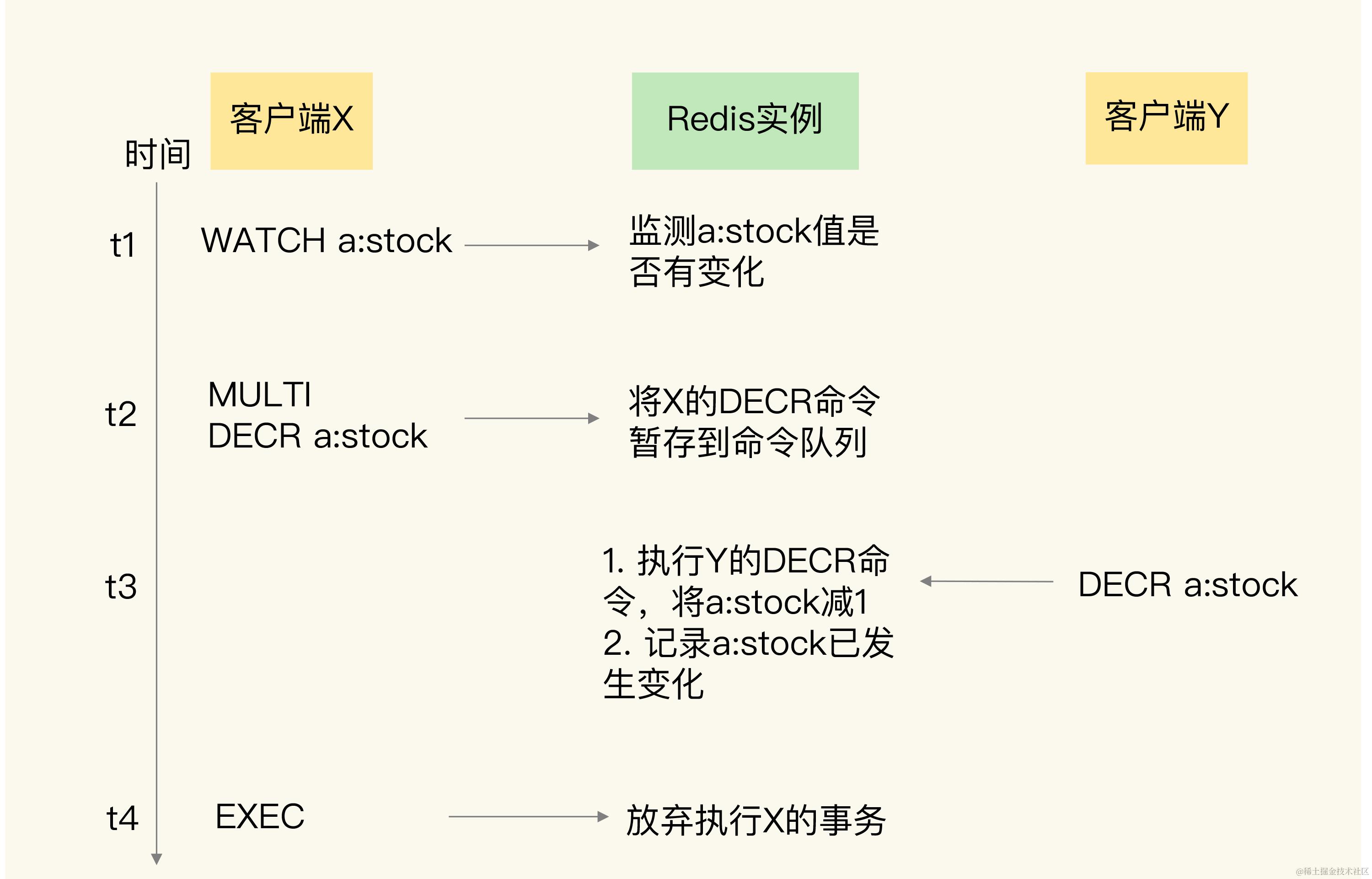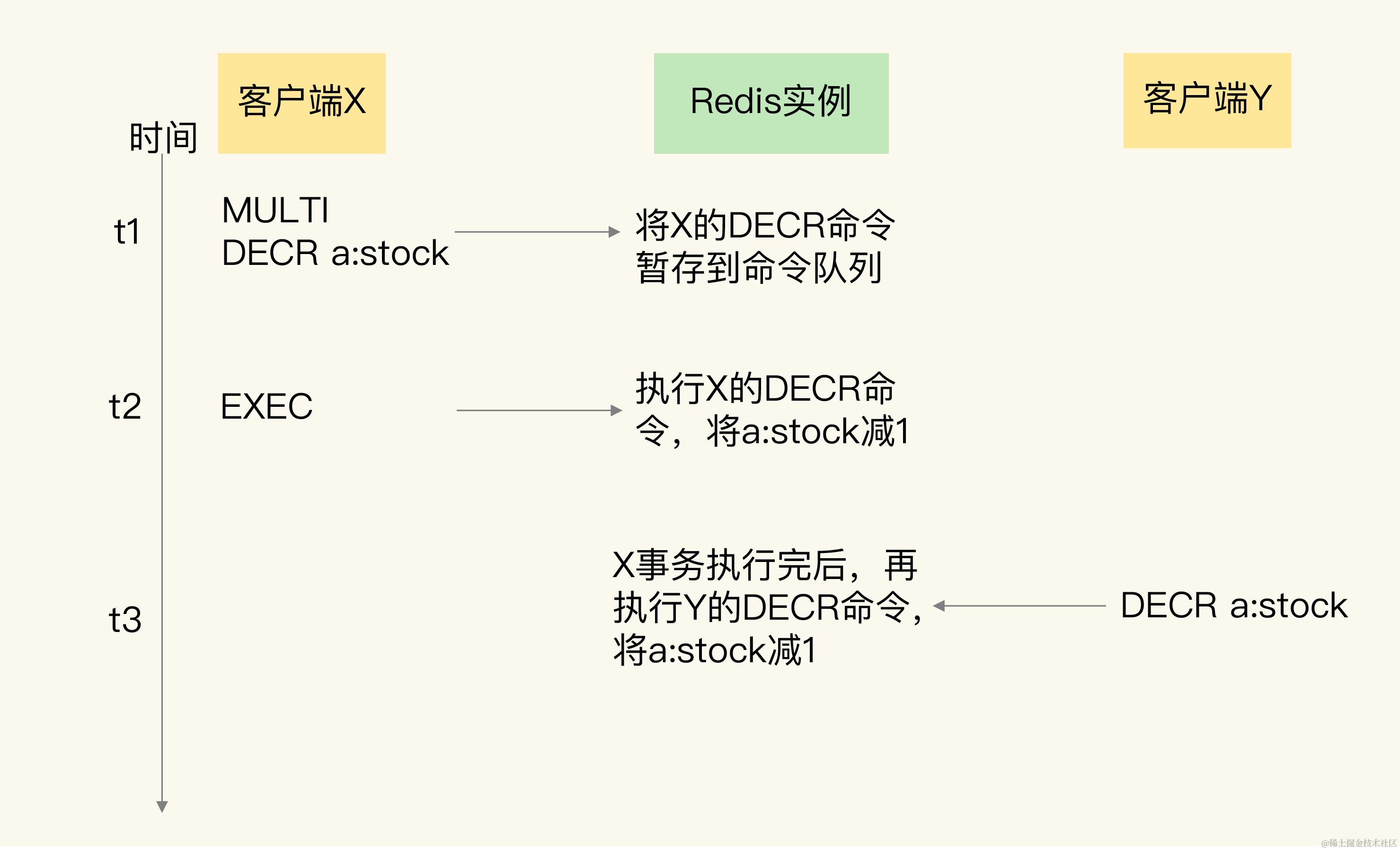 在t3时,客户端Y也给实例发送了一个DECR命令,要修改a:stock的值,实例收到命令后就直接执行了。