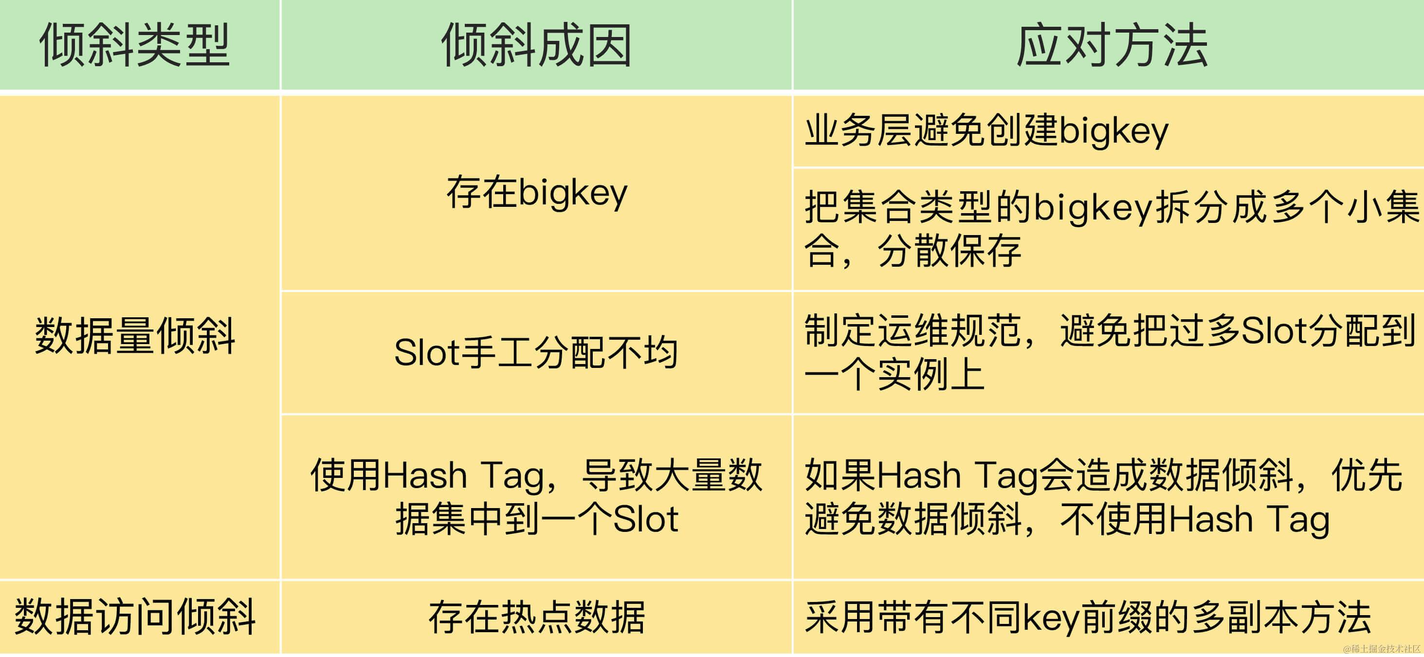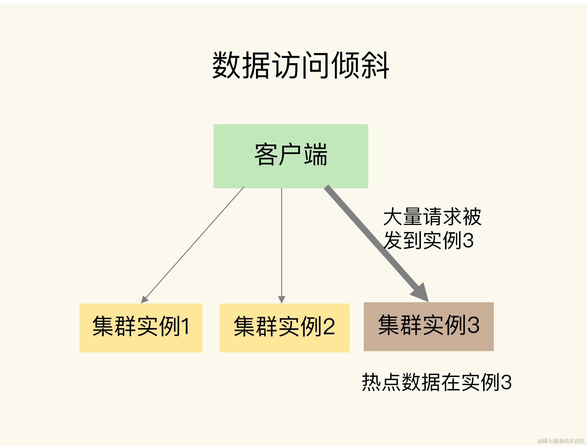 - 数据访问倾斜:虽然每个集群实例上的数据量相差不大,但是某个实例上的数据是热点数据,被访问得非常频繁。