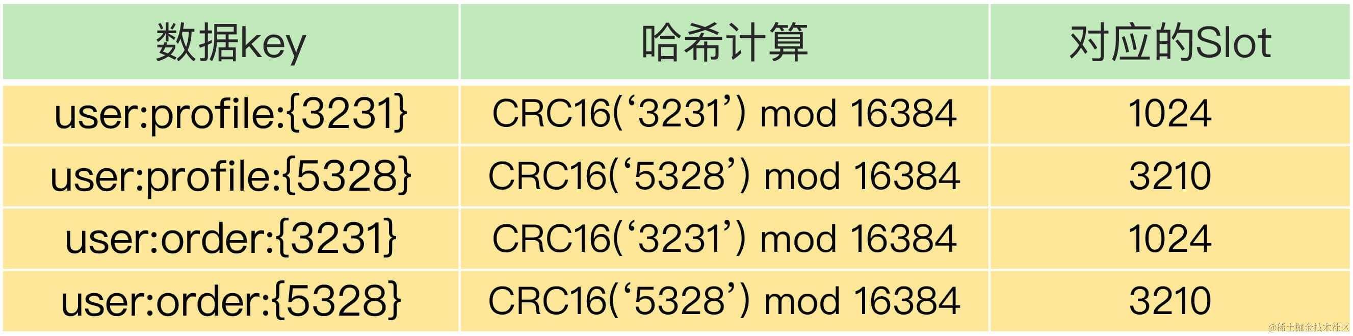下面这张表就显示了使用Hash Tag后,数据被映射到相同Slot的情况,你可以看下。