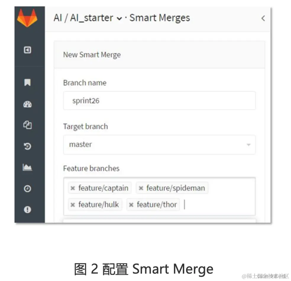 这时,资深测试工程师“黑寡妇”也没闲着,开始查看起本周计划完成的 issue,整理出功能 点、性能要求和粗粒度的接口列表,基本明确了测试范围。随后,她在公司 GitLab 平台上为本 周迭代设置好了“Smart Merge”,如图 2 所示。