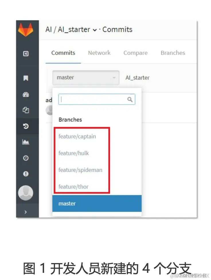 “美国队长”“绿巨人”“雷神”“蜘蛛侠”这 4 名开发人员早已熟悉团队的工作流程,午休 之后,他们纷纷打开 GitLab 界面,在待办事项上找到自己的 issue,查看无误后,直接根据 issue 建好了新的特性分支。
