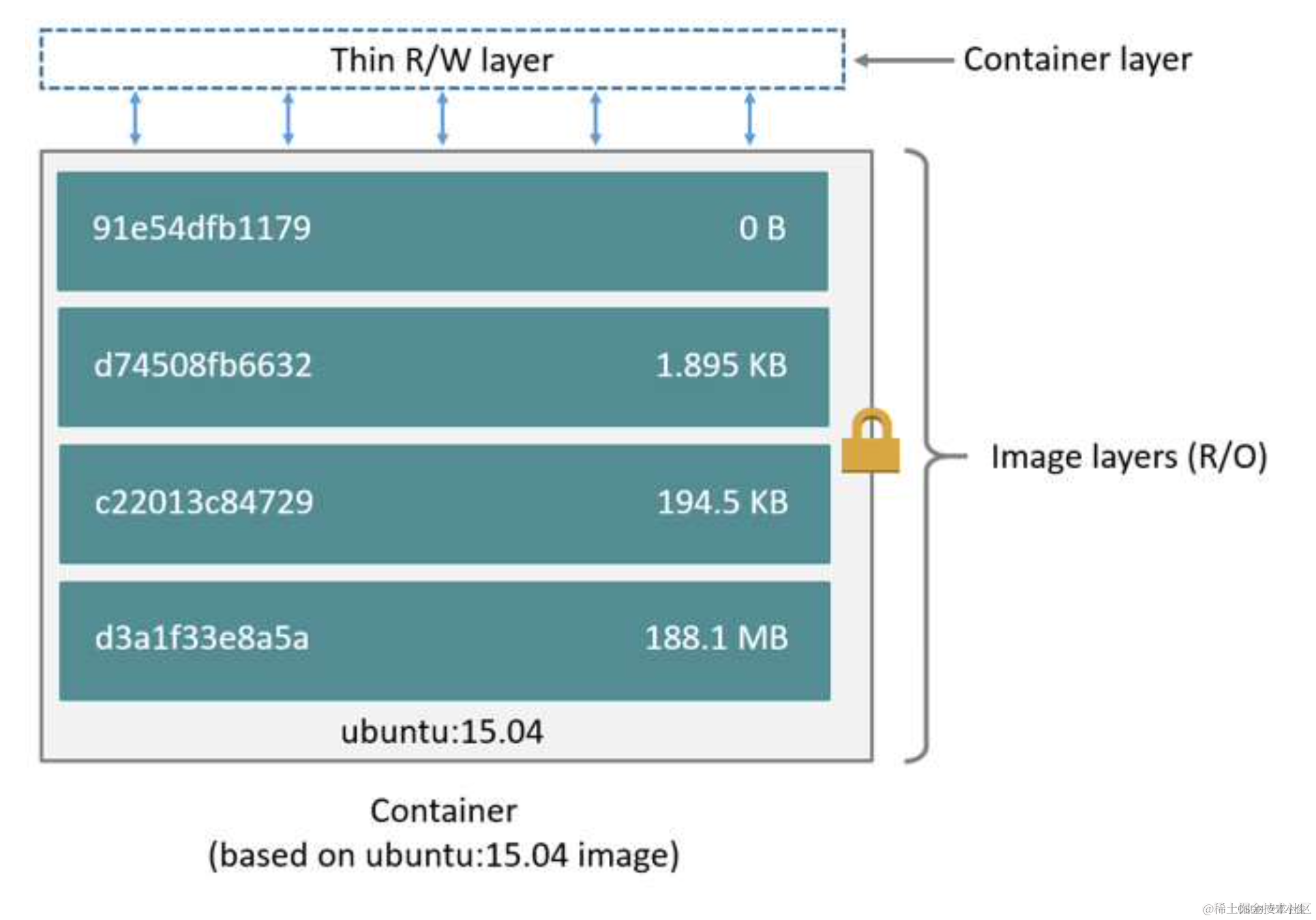 图中的镜像部分画了一个锁的标记,它表示镜像中的每一层都是只读的,只有创建容器时才会在最上层添加一个叫作Containerlayer的可写层。容器运行后的所有修改都是在这个可写层进行,而不会影响容器镜像本身。