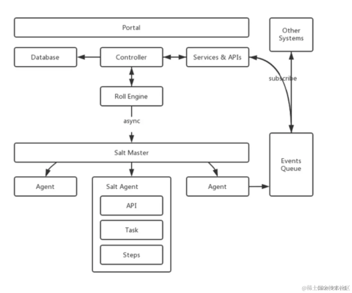 Roll Engine,即发布引擎,主要负责创建发布批次,按批次粒度实施部署策略,通过异步方式调用 Salt Master 服务,再分发到各个 Agent 节点上执行部署任务。真正的单机部署脚本会根 据不同的应用或机型进行分发和定制。而 Controller ,则作为接收外部指令和读写数据的控制 器。当然,对于一些对外的通知事务,发布系统会采用消息机制向外广播。