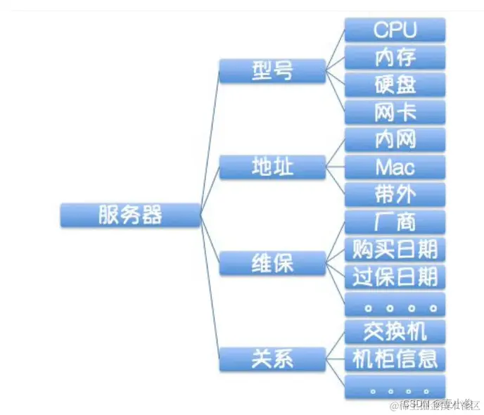 第二步,识别对象的属性,比如服务器就会有SN序列号、IP地址、厂商、硬件配置(如CPU、内存、硬盘、网卡、PCIE、BIOS)、维保信息等;网络设备如交换机也会有厂 商、型号、带宽等信息。